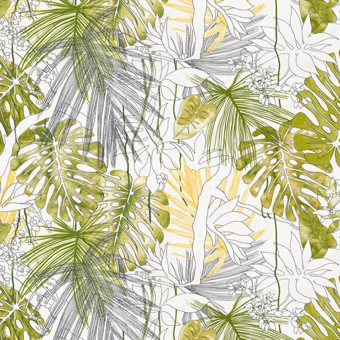 En exklusiv, vit digitaltapet med motiv av stora blad i färgerna grönt, gult och svart. Tapeten går ej att måttbeställa, de färdiga måtten finns specificerade på en utav produktbilderna. Denna non woven tapet, även kallad easy up, är enkel att tapetsera då du rollar limmet direkt på väggen för att sedan fästa tapeten. Den har även en vinylyta, vilket innebär att den är avtorkningsbar.