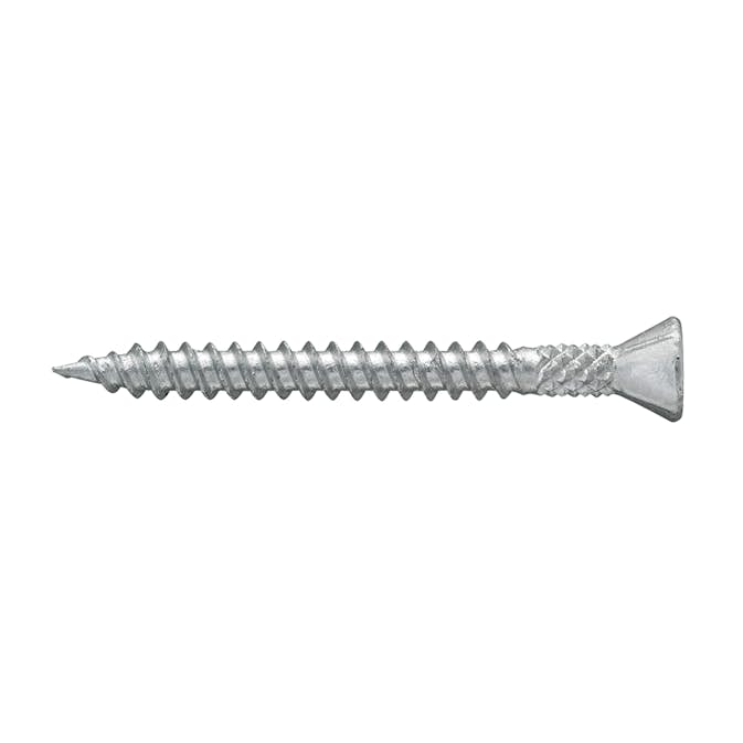 Vass spets med dubbelledande gängor som griper omedelbart, penetrerar mycket snabbt i stålregeln, samtidigt som rillorna under huvudet försänker skruven.