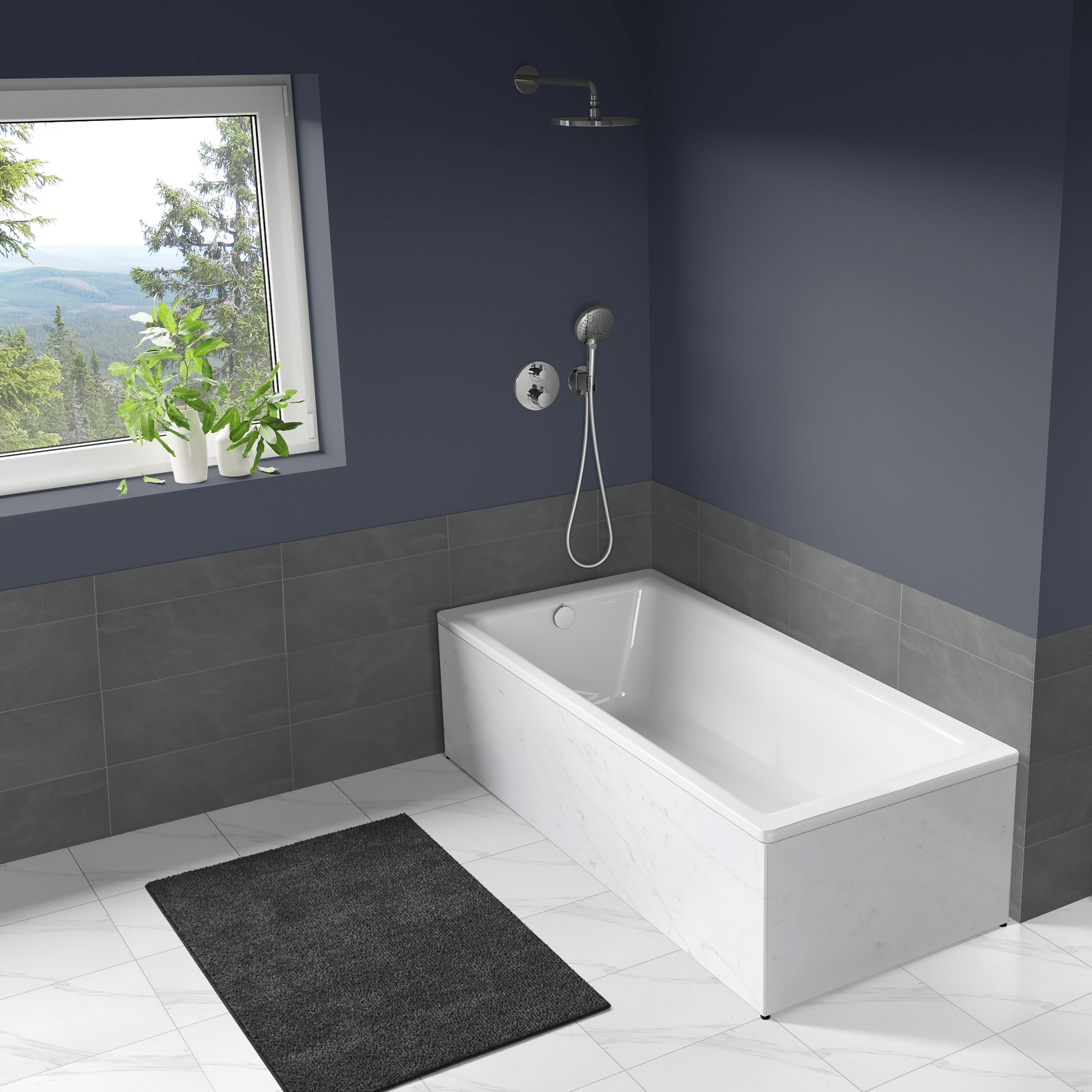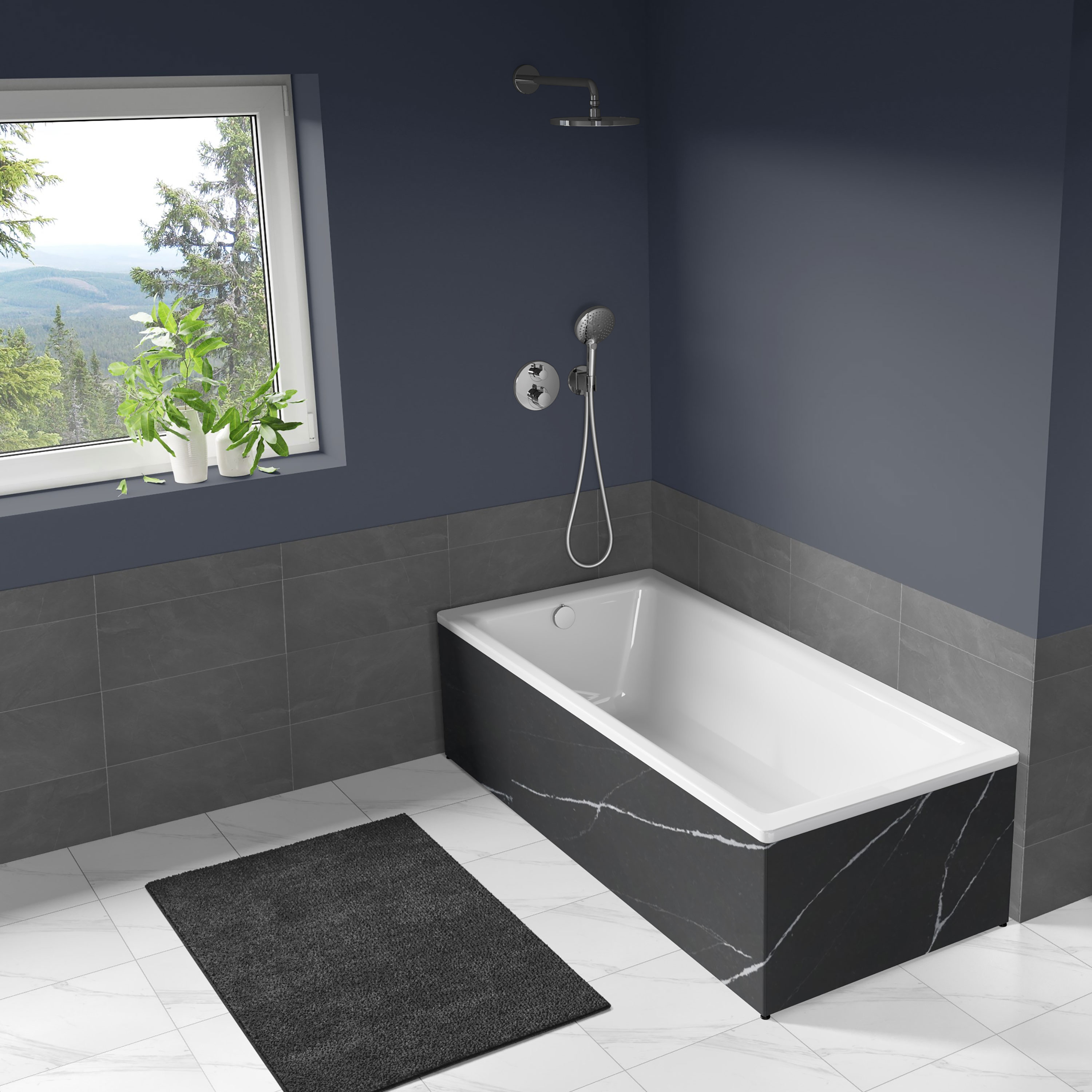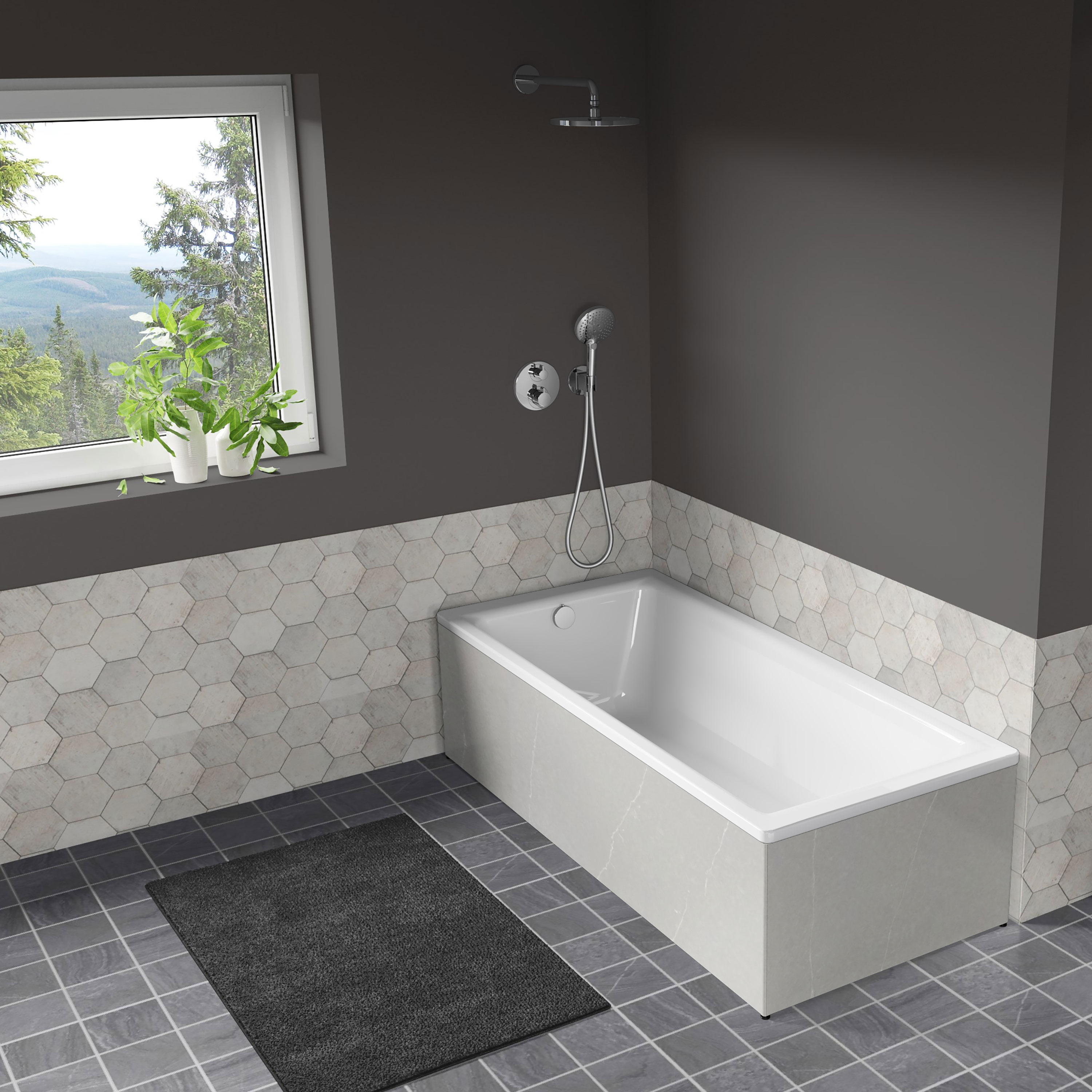 Badkarets fronter är gjorda av stenkomposit, Silestone, som sägs vara tåligare än granit. Med dessa stenfronter behöver du inte längre välja mellan att dölja badkarets undersida och möjligheten att komma åt. Fronten kan enkelt lyftas av från badkaret och efter att du har rengjort under badkaret är det lika enkelt att hänga tillbaka fronten.