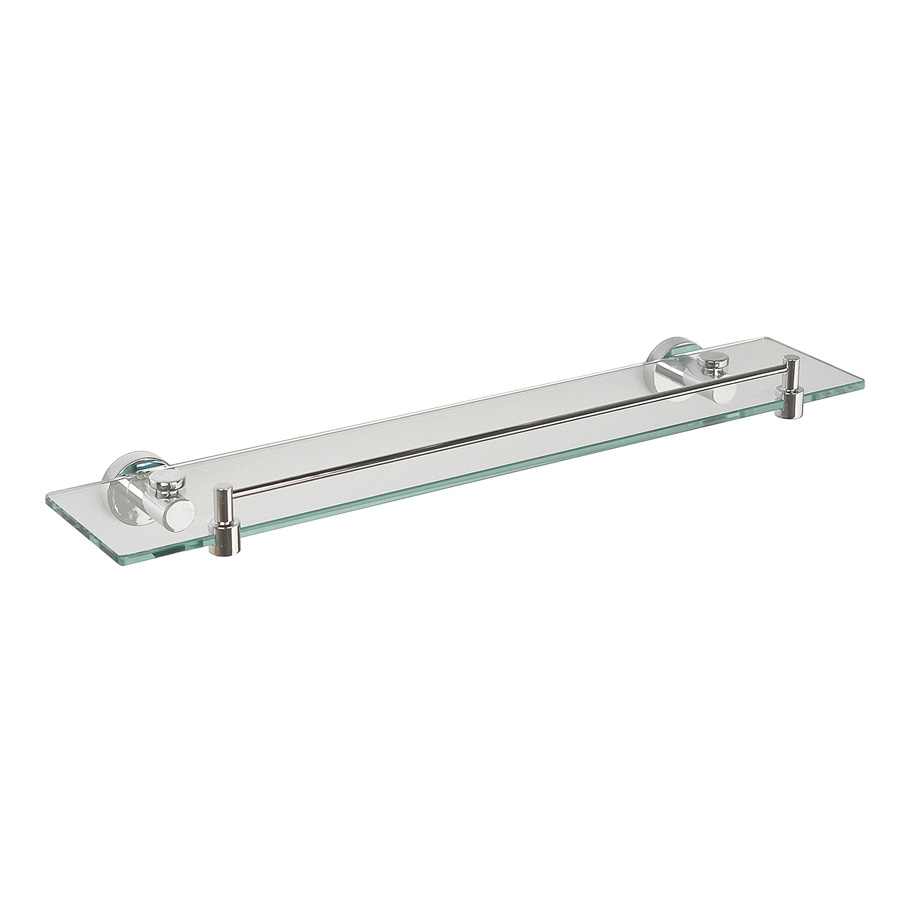 Glashylla av härdat klarglas med räcke. Väggplattans diameter är 45 mm. Serien Bond finns i olika utföranden.