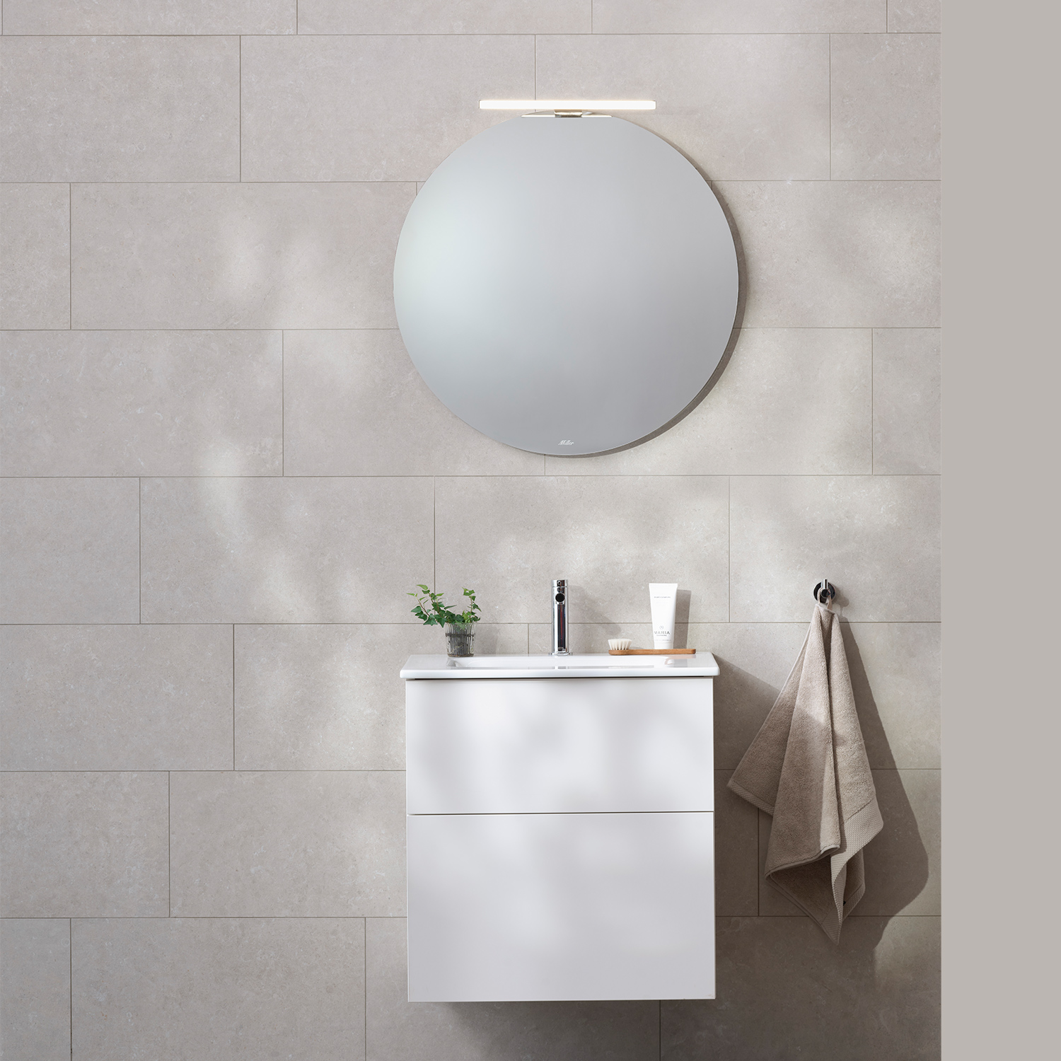 Möbelpaket från Miller Badrum med kommod, tvättställ och rund spegel med toppbelysning.