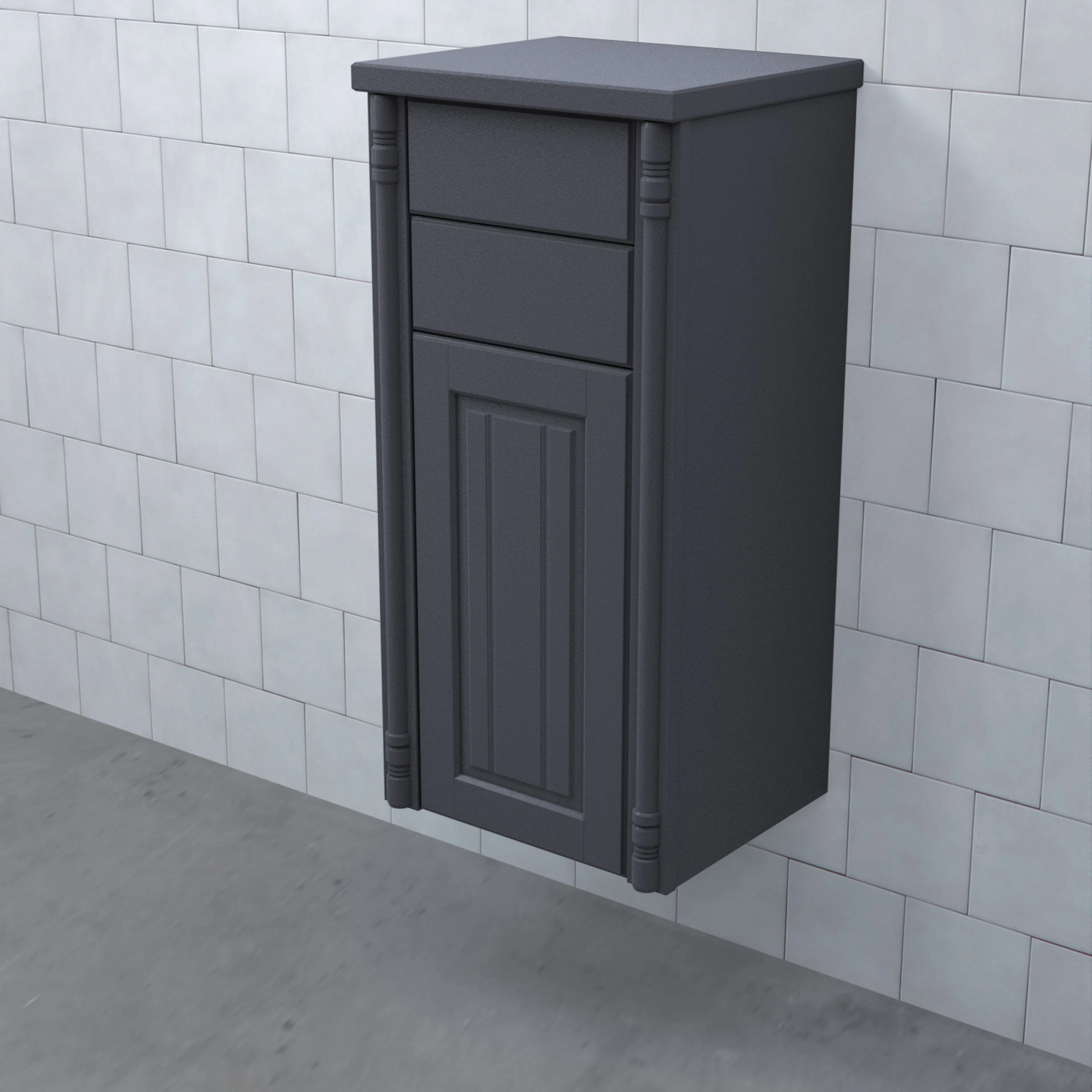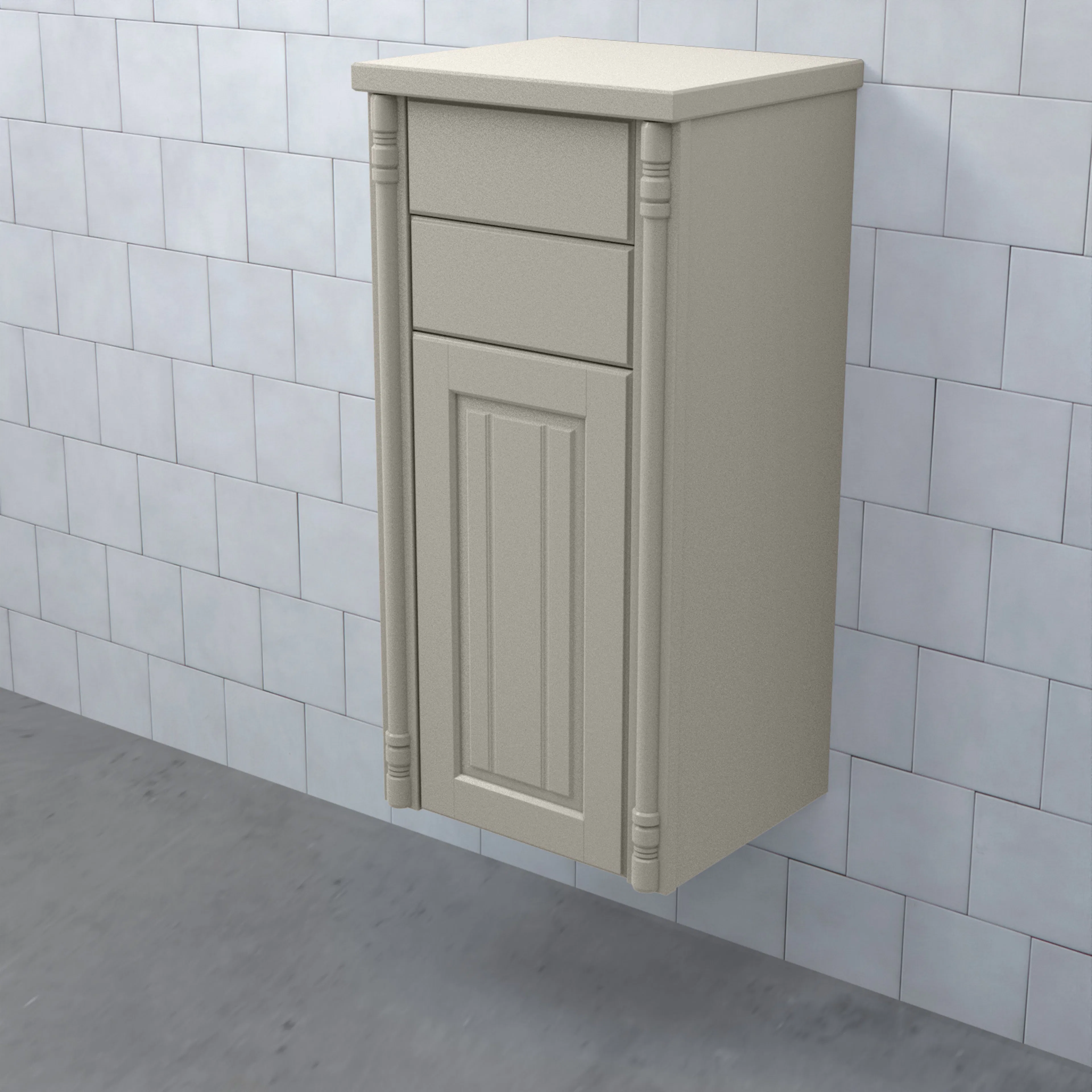 Halvhögt Skåp Valhall med Lucka och 2 Lådor från Björbo Badrum är ett stilren badrumsskåp med romantiska sekelskiftesinslag. Detta praktiska skåp har två fullutdragslådor med dämpning och självindrag och en lucka. Hyllplanet har samma färg som skåpet.