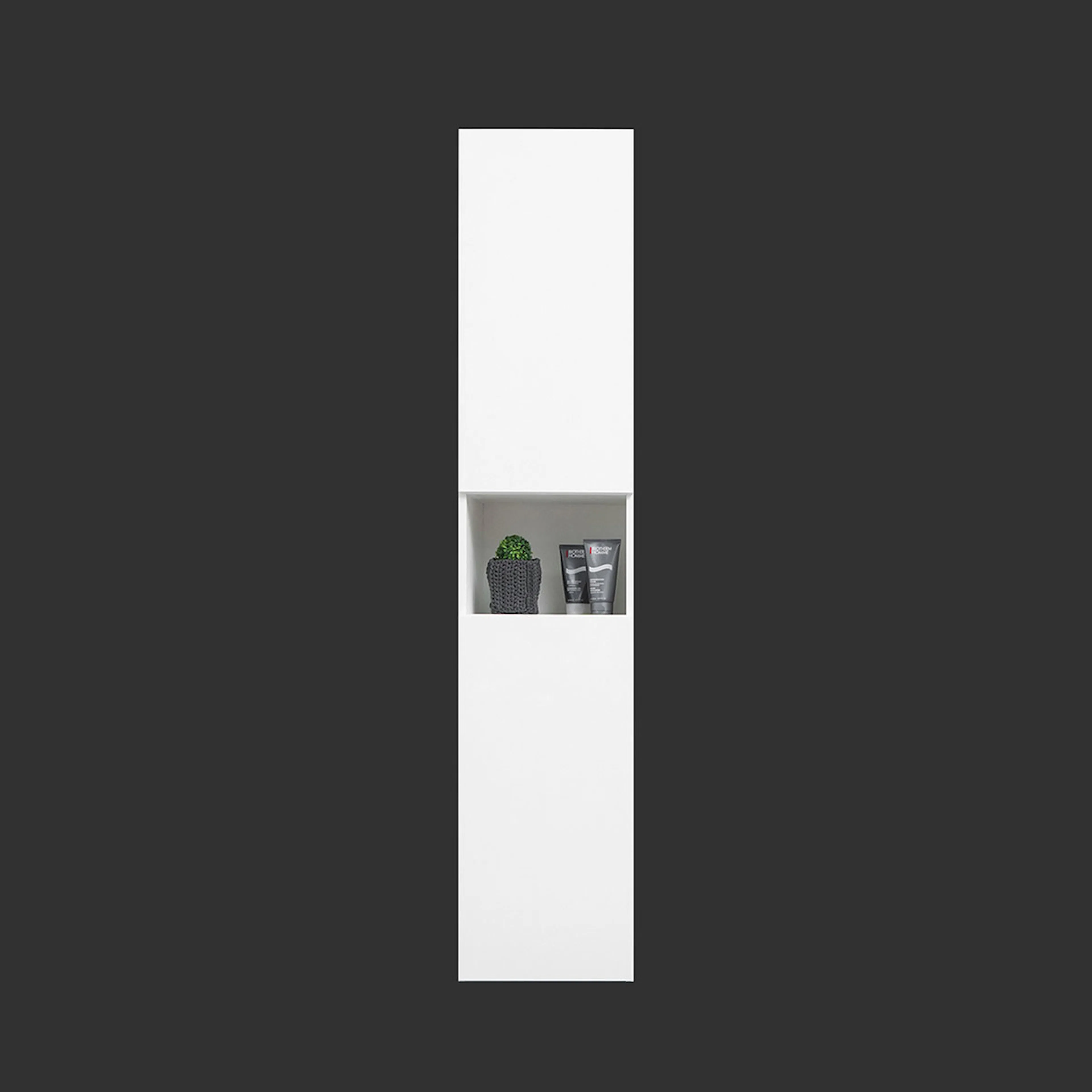 Högskåp 4AQUA 2 är ett högskåp med två dörrar och ett öppet hyllplan. Med stilren design passar detta högskåp in i de flesta hem. Luckorna kan monteras till höger eller vänster och du väljer själv vilket håll luckan ska öppnas åt. Inuti skåpet finns glashyllor med justerbar höjd och en hyllbärare som är fixerad.