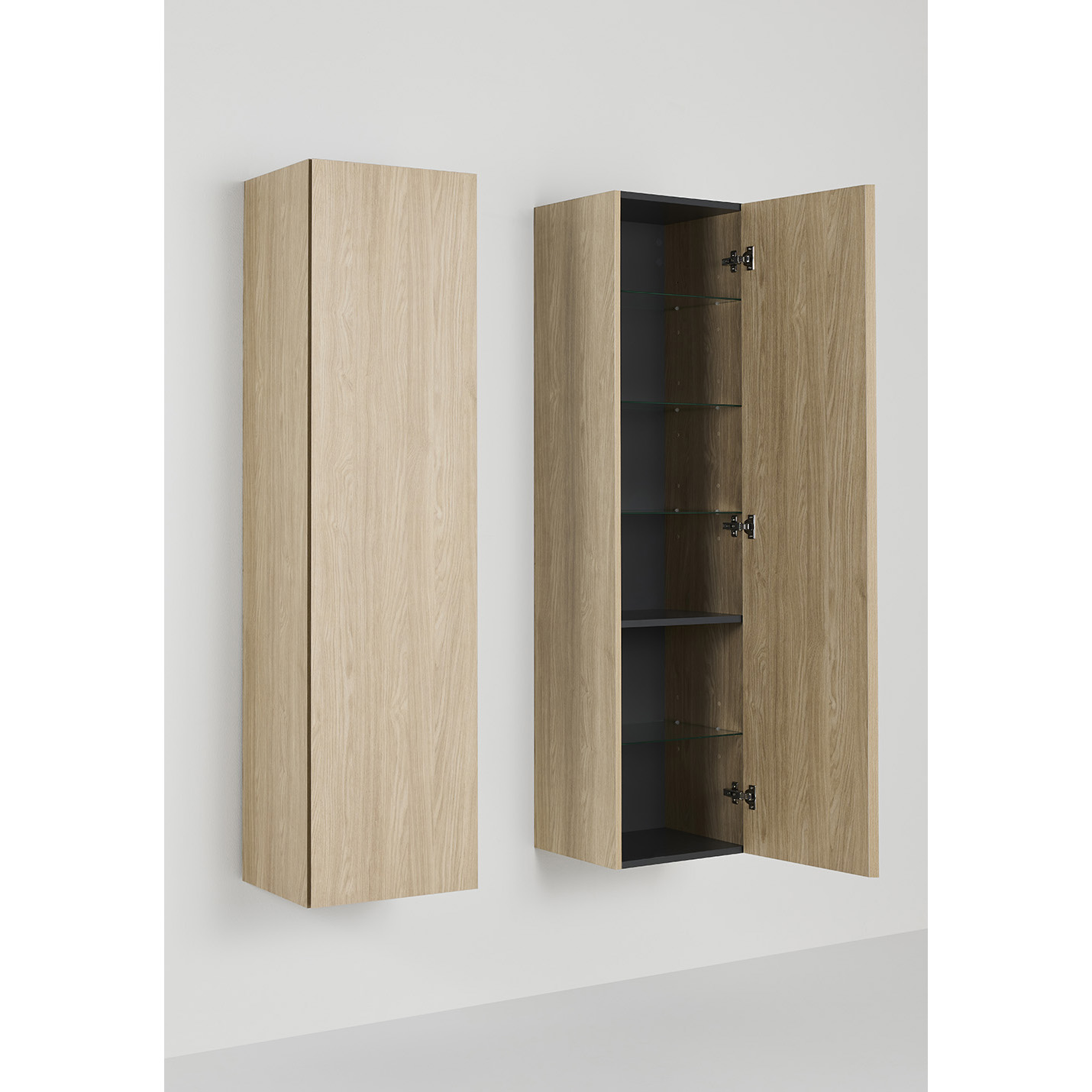 Inuti skåpet finns ett fast hyllplan samt fyra glashyllor med justerbar höjd och fixerande hyllbärare. Högskåpet är färdigmonterat och monteras enkelt upp på skena på vägg. Luckan kan monteras på höger eller vänster sida.