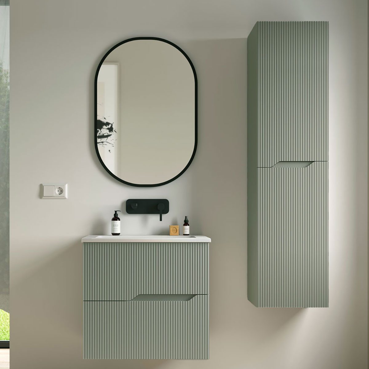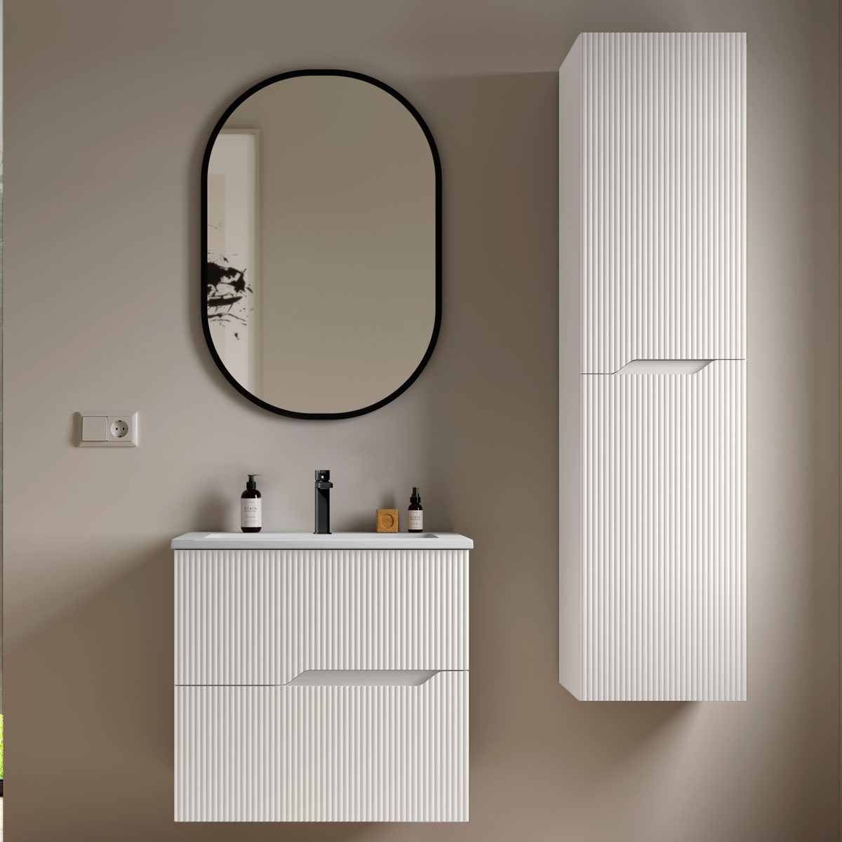 Högskåpet finns i fyra vackra färgalternativ: vitt, salvia, mullvad och ek, alla med en sofistikerad matt yta. Den matta finishen bidrar till en känsla av lugn och harmoni, och smälter väl in i moderna inredningsstilar. Färgvalen gör det möjligt att hitta den perfekta nyansen för att komplettera ditt badrums inredning och skapa en enhetlig look.