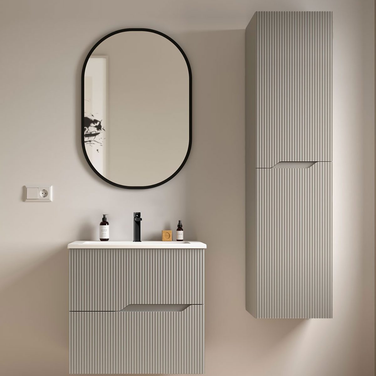 För att skapa ett harmoniskt och enhetligt badrum, kan du komplettera detta högskåp med en matchande kommod från samma serie. Serien erbjuder en genomtänkt och stilren design som håller hela badrummet samman i en elegant helhet. Det texturerade utförandet på skåpsfronterna ger en naturlig och varm känsla, vilket förhöjer intrycket av ditt badrum.