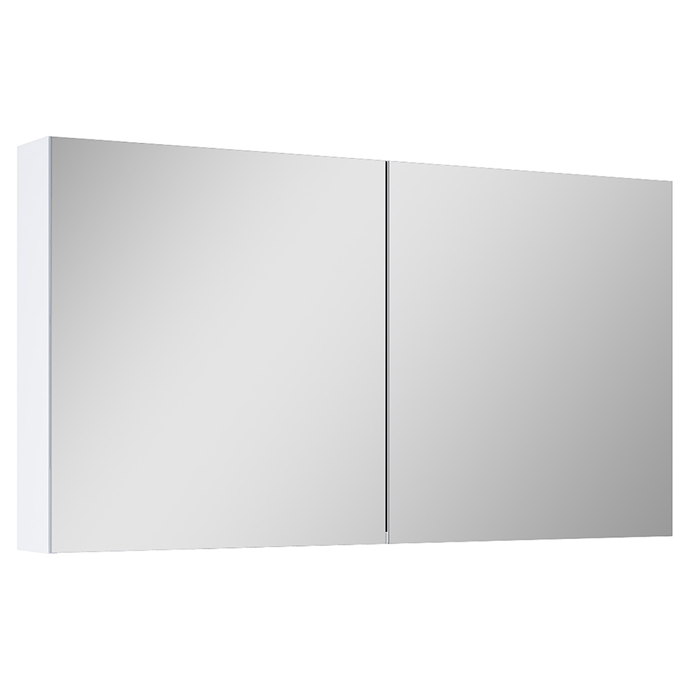 Hyllplanen i glas är flyttbara och skåpet har ett eluttag inuti. Dörrarna är mjukstängande och har speglar på båda sidor. Levereras färdigmonterat.