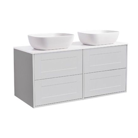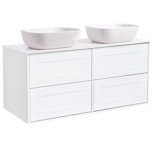 Tvättställsskåp Alterna Gabriella med bänkskiva och två rektangulära ovanpåliggande tvättställ. Bänkskivan är gjord av kvartskomposit och tvättställen i porslin, 415x415x135 mm. Underskåpen har mjukstängande lådor. Handtag och blandare beställs separat.