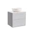 Tvättställsskåp Alterna Gabriella med bänkskiva och runt ovanpåliggande tvättställ. Bänkskivan är gjord av kvartskomposit och tvättställ i porslin, 415x415x135 mm. Underskåpen har mjukstängande lådor som ger en lyxig och tyst användning samtidigt som de ökar möbelns livslängd.