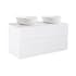 Tvättställsskåp Alterna Isella levereras med bänkskiva och ovanpåliggande tvättställ. Bänkskivan är gjord av kvartskomposit och levereras med två tvättställ i porslin, dia 415 mm. Underskåpen har mjukstängande lådor. Handtag och blandare beställs separat.
