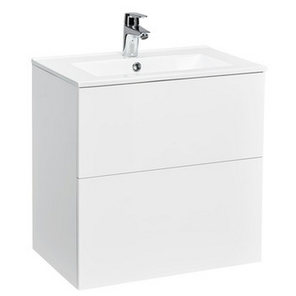 Tvättställsskåp Isella bjuder på en enkel men snygg design som präglas av de tunna och raka linjerna. Det smidiga tvättstället i mineralkomposit adderar ytterligare karaktär till möbeln. Lådorna är mjukstängande.