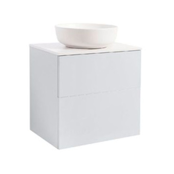 Tvättställsskåp Alterna Isella levereras komplett med bänkskiva och ovanpåliggande tvättställ. Bänkskivan är gjord av kvartskomposit och tvättställ i porslin, dia 415. Underskåpen har mjukstängande lådor. Handtag beställes separat. Handtag och blandare beställs separat.