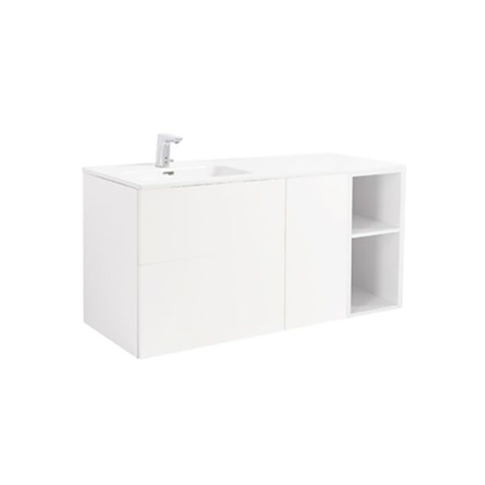 Tvättställsskåp Alterna Isella med Öppen Förvaring är ett möbelpaket bestående av underskåp, tvättkorgsskåp, tvättkorg samt två öppna fack. Perfekt för att gömma undan både smutstvätt och annat som man inte vill ha liggande framme. Det snygga tvättstället går att få med bassängen till höger eller vänster. Isellas rena, raka linjer ger ett enkelt, jordnära och ungdomligt intryck.