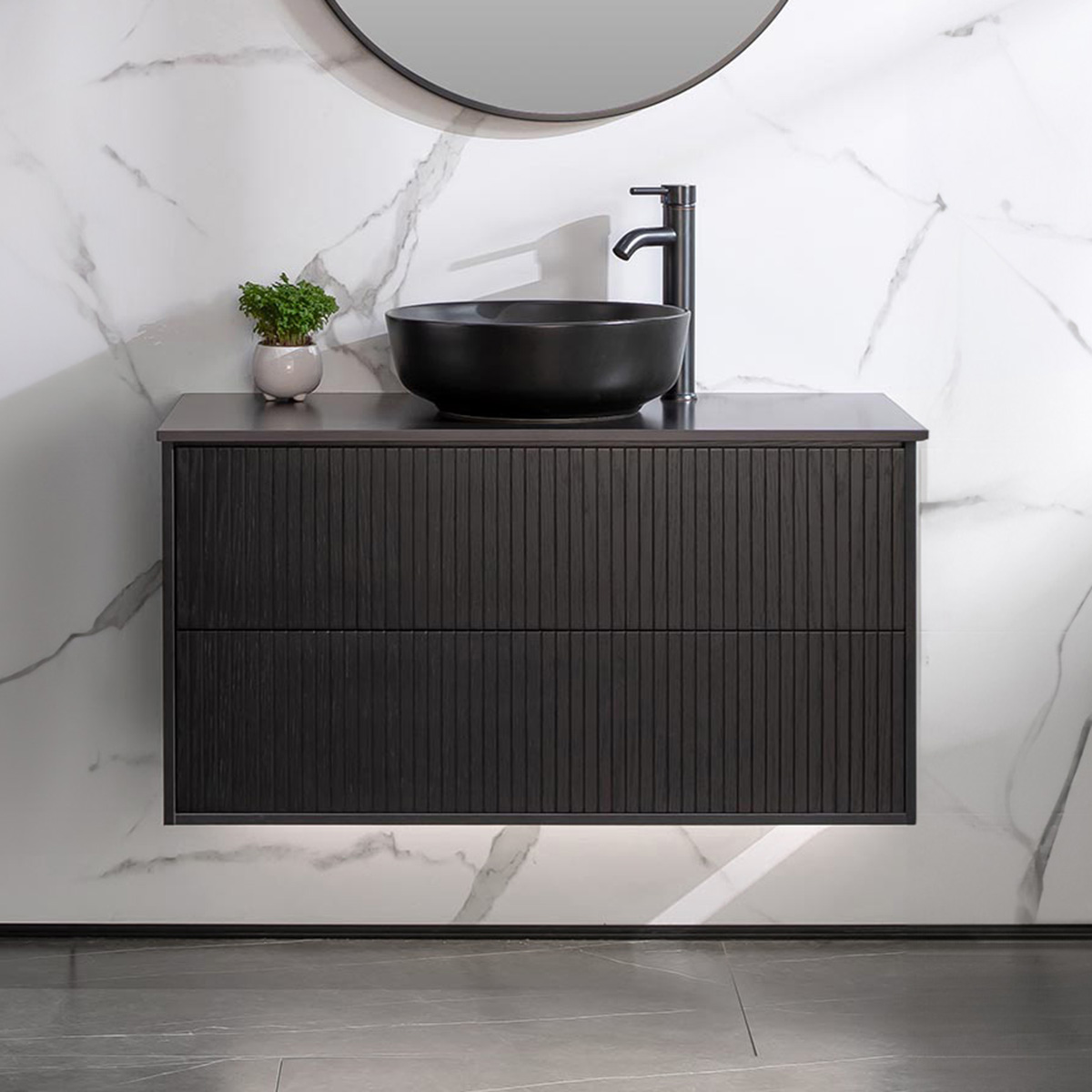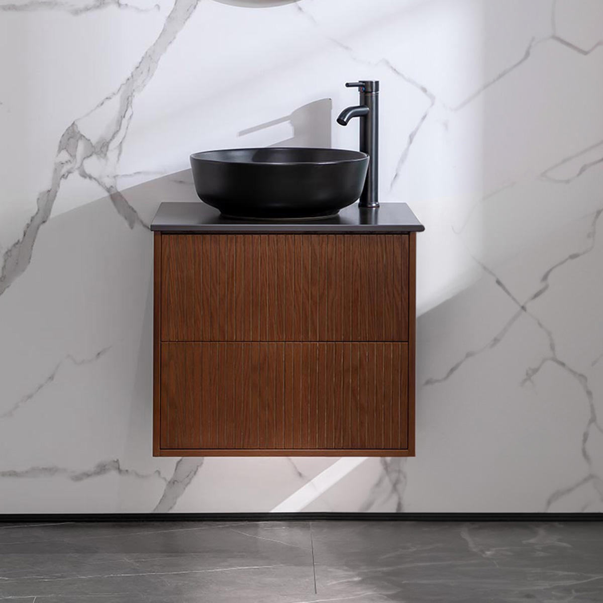 I vitt och ekutförande ingår bänkskiva i vit Carraramarmor. I svart och brun ek ingår bänkskiva i svart granitkeramik. Skåpet ger snygg och smart förvaring i de två lådorna som är mjukstängande. Lådorna har så kallad push-open funktion, vilket innebär att man öppnar lådorna genom ett tryck på utsidan. Tvättställsskåpet har batteridriven lådbelysning (AAA-batterier, ingår ej) och även eluttag (230 V).