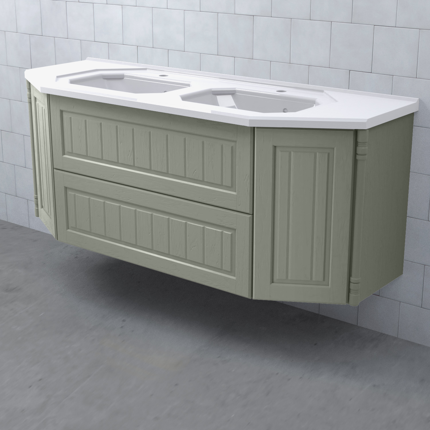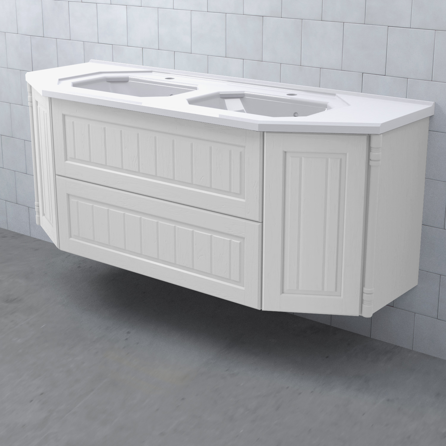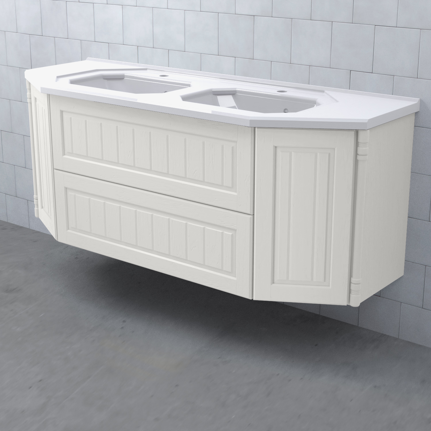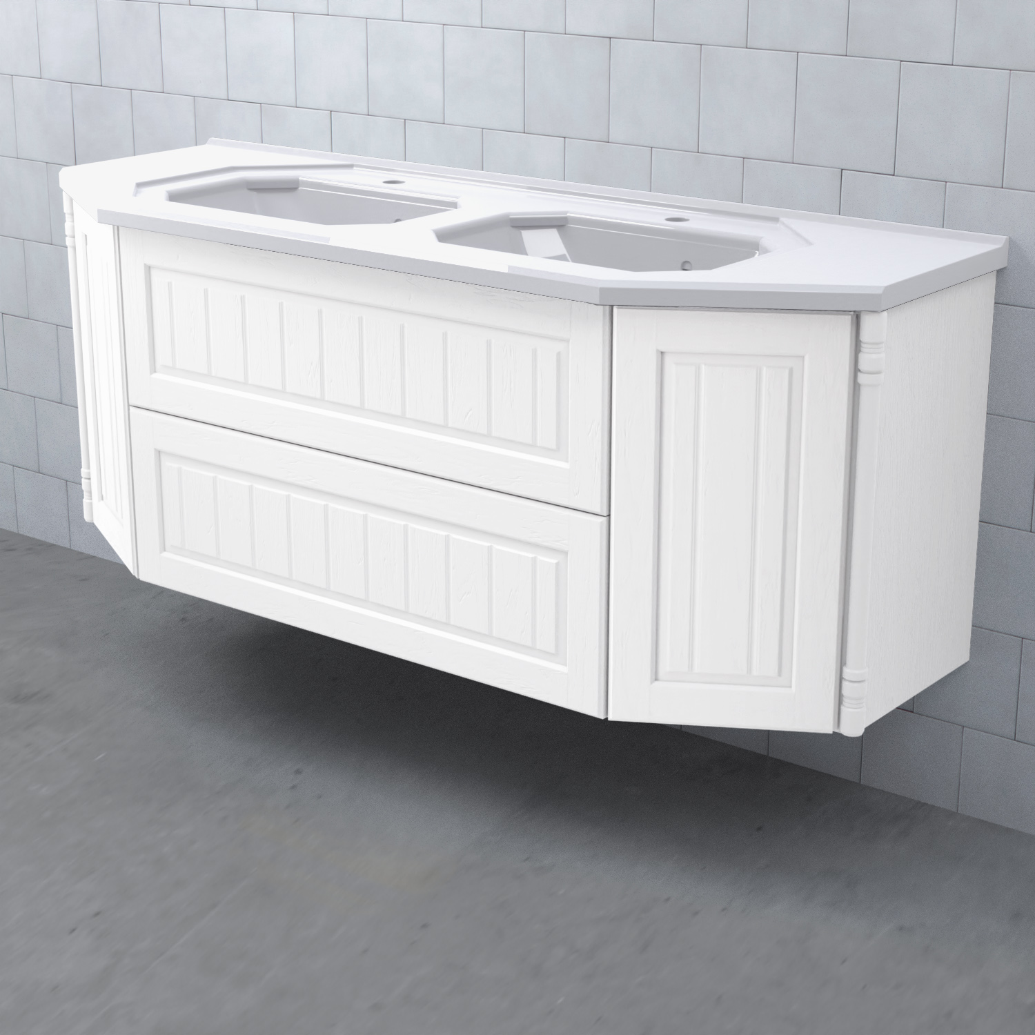 Tvättställsskåp Valhall 150 Lådor Dubbel från Björbo Badrum är ett elegant tvättställsskåp anpassat för dubbla handfat med sekelskiftesdetaljer som levereras utan tvättställ, handtag och blandare. Badrumsskåpet har två stabila fullutdragslådor med dämpning och självindrag och två sidoskåp med luckor. Det leverer med vattenlås, lådindelare och lådmattor. Skåpet är tillverkat av målad MDF.