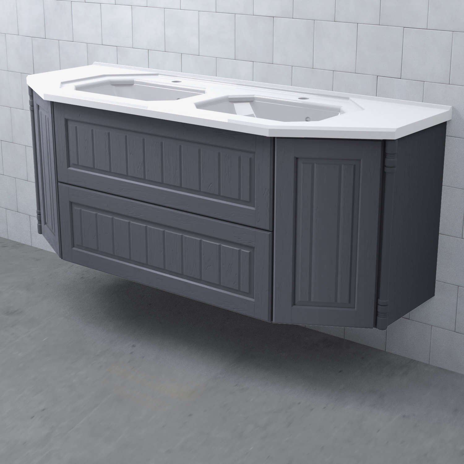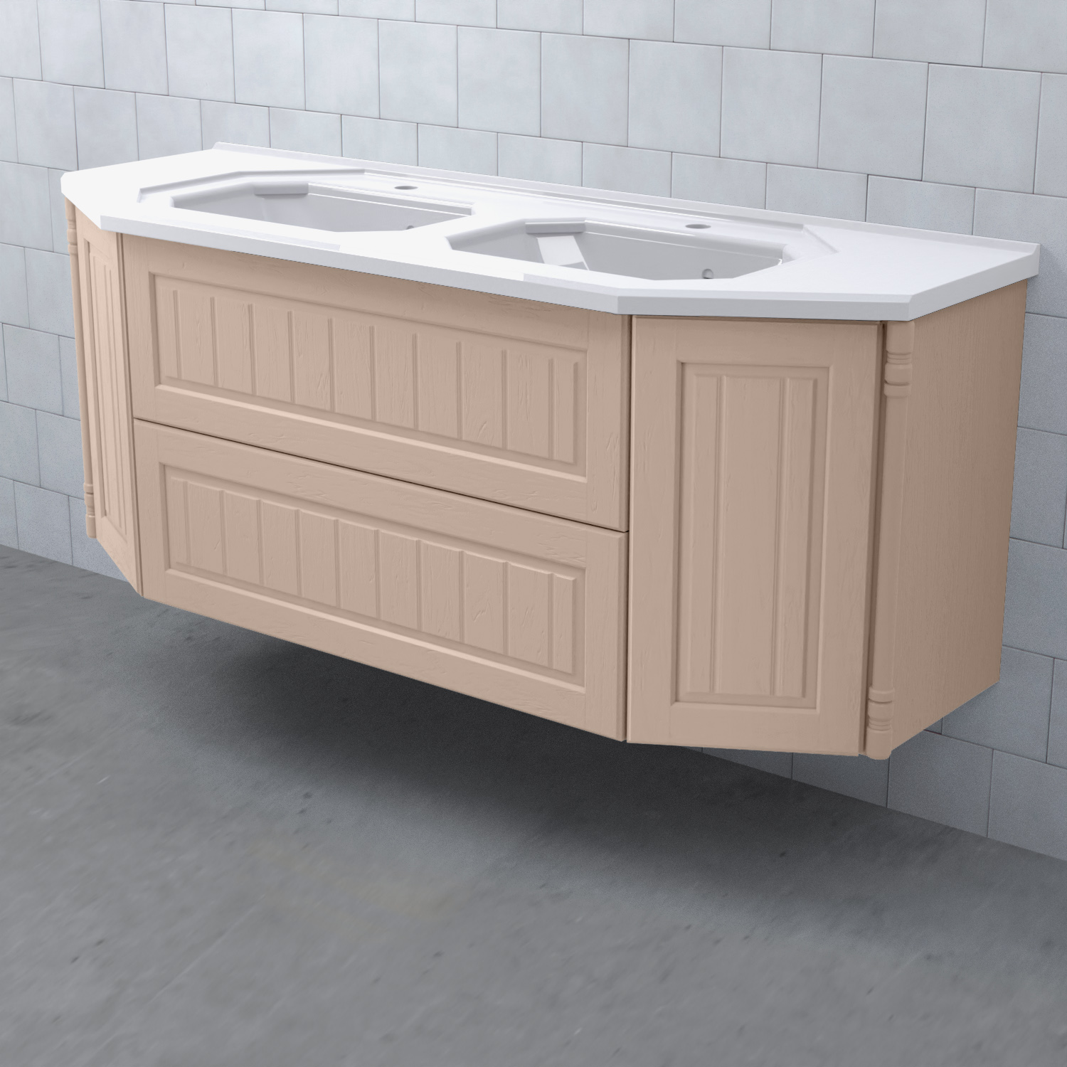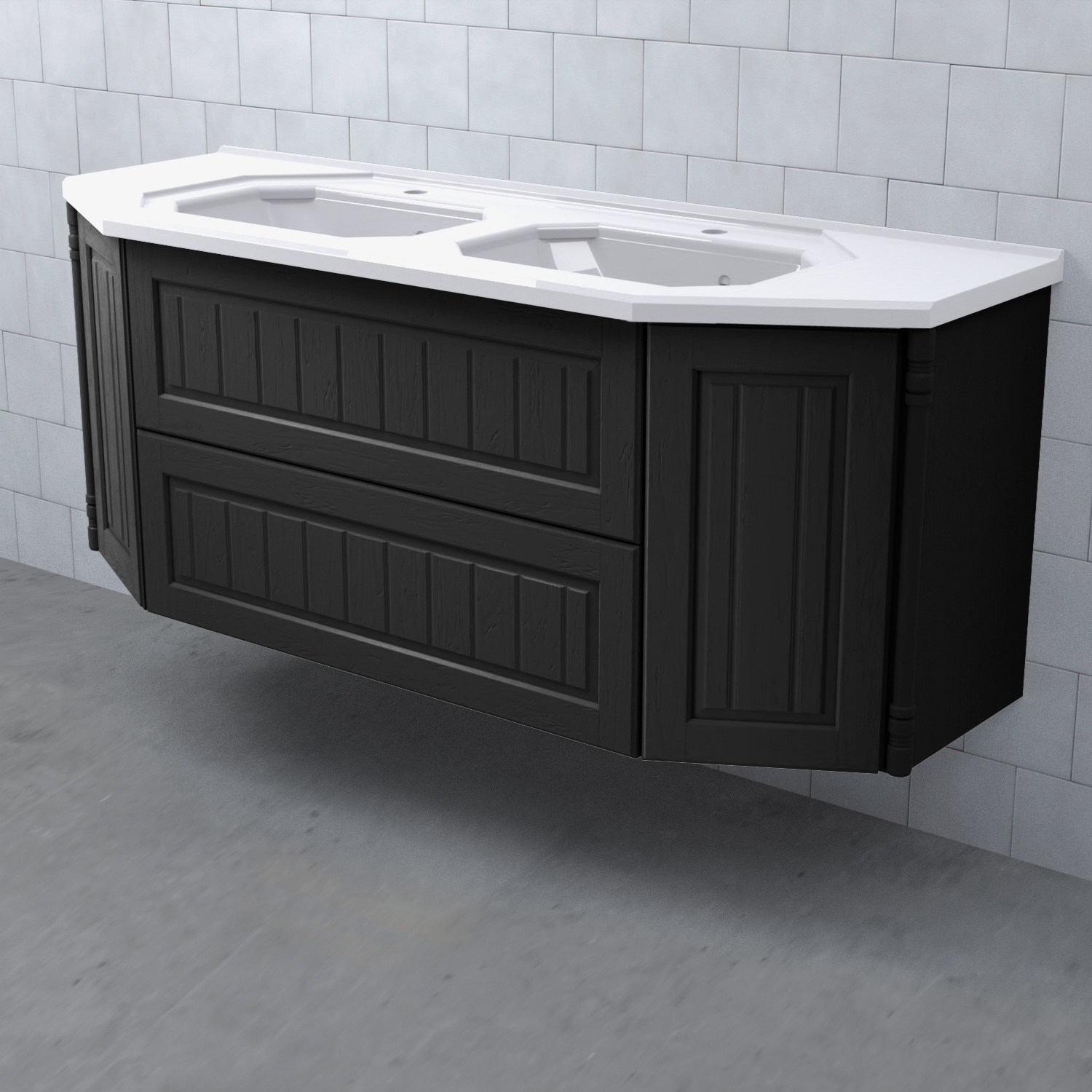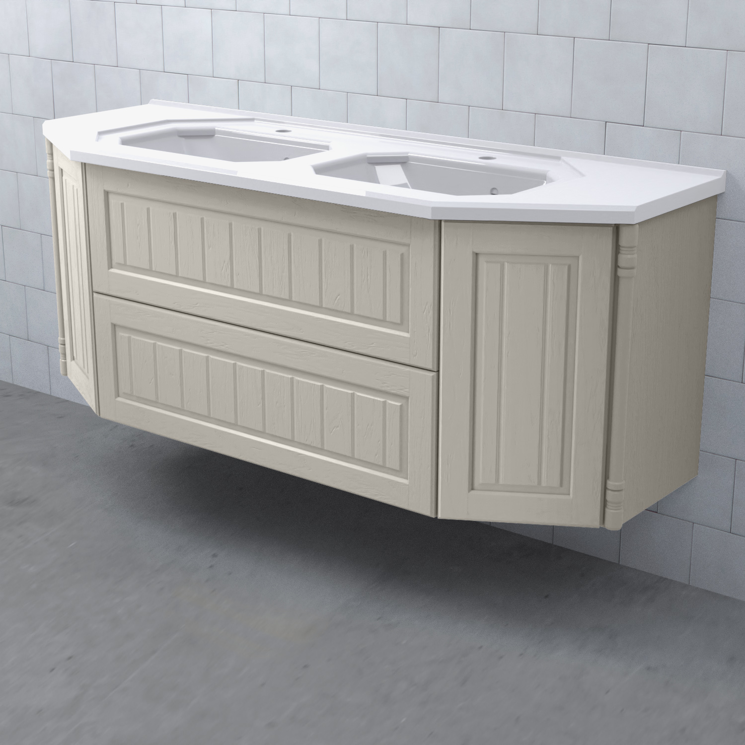 Tvättställsskåp Valhall 150 Lådor Dubbel från Björbo Badrum är ett elegant tvättställsskåp anpassat för dubbla handfat med sekelskiftesdetaljer som levereras utan tvättställ, handtag och blandare. Badrumsskåpet har två stabila fullutdragslådor med dämpning och självindrag och två sidoskåp med luckor. Det leverer med vattenlås, lådindelare och lådmattor. Skåpet är tillverkat av målad MDF.