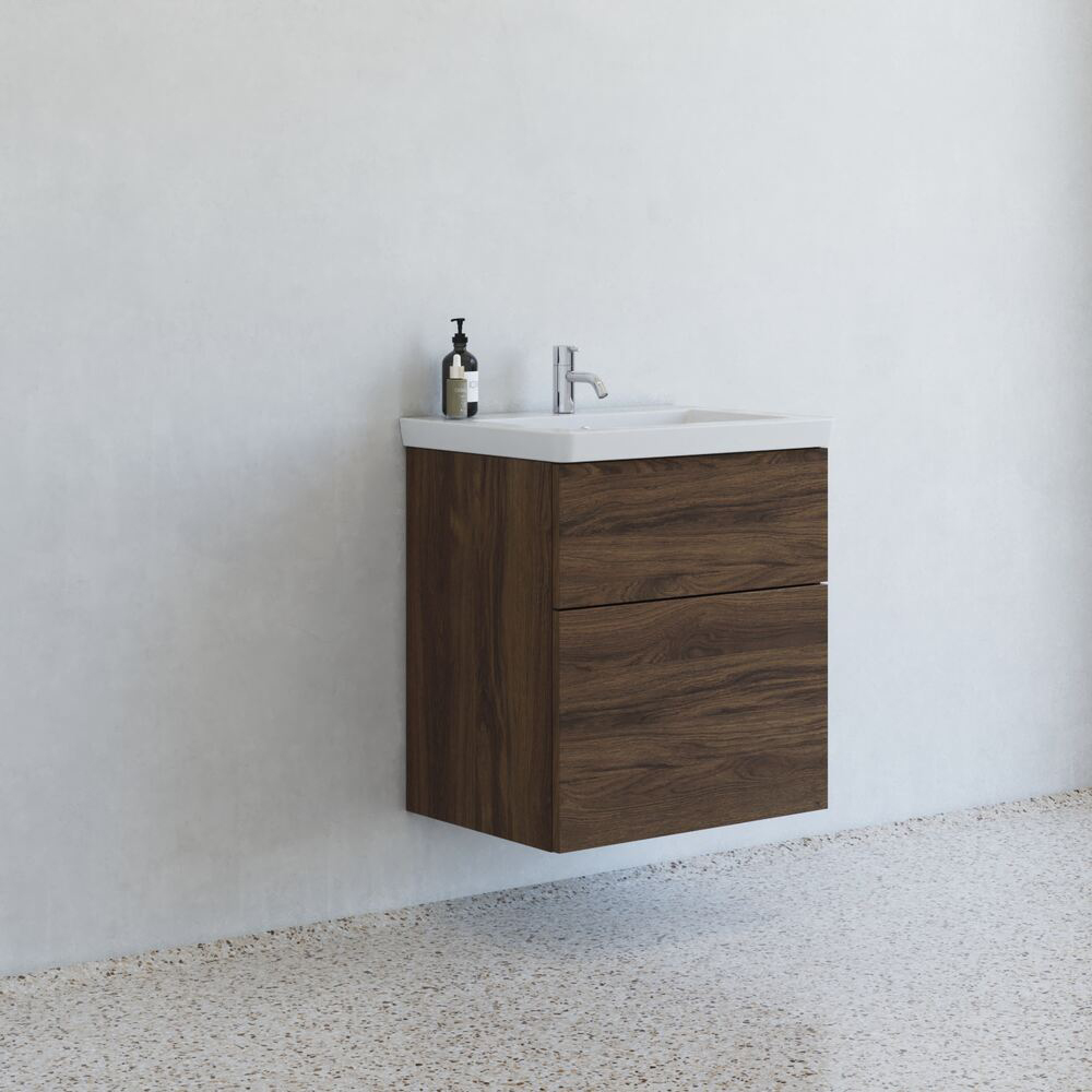 Tvättställsskåpet rymmer två praktiskt utformade lådor med fokus på effektiv förvaring. Den övre lådan är anpassad för mindre badrumsartiklar, medan den nedre är extra hög och ger plats åt större föremål som handdukar, flaskor och hårfön. Samtliga lådor är fullt utdragbara så att du enkelt når även längst in, och har mjukstängande funktion som säkerställer en tyst och kontrollerad stängning varje gång.