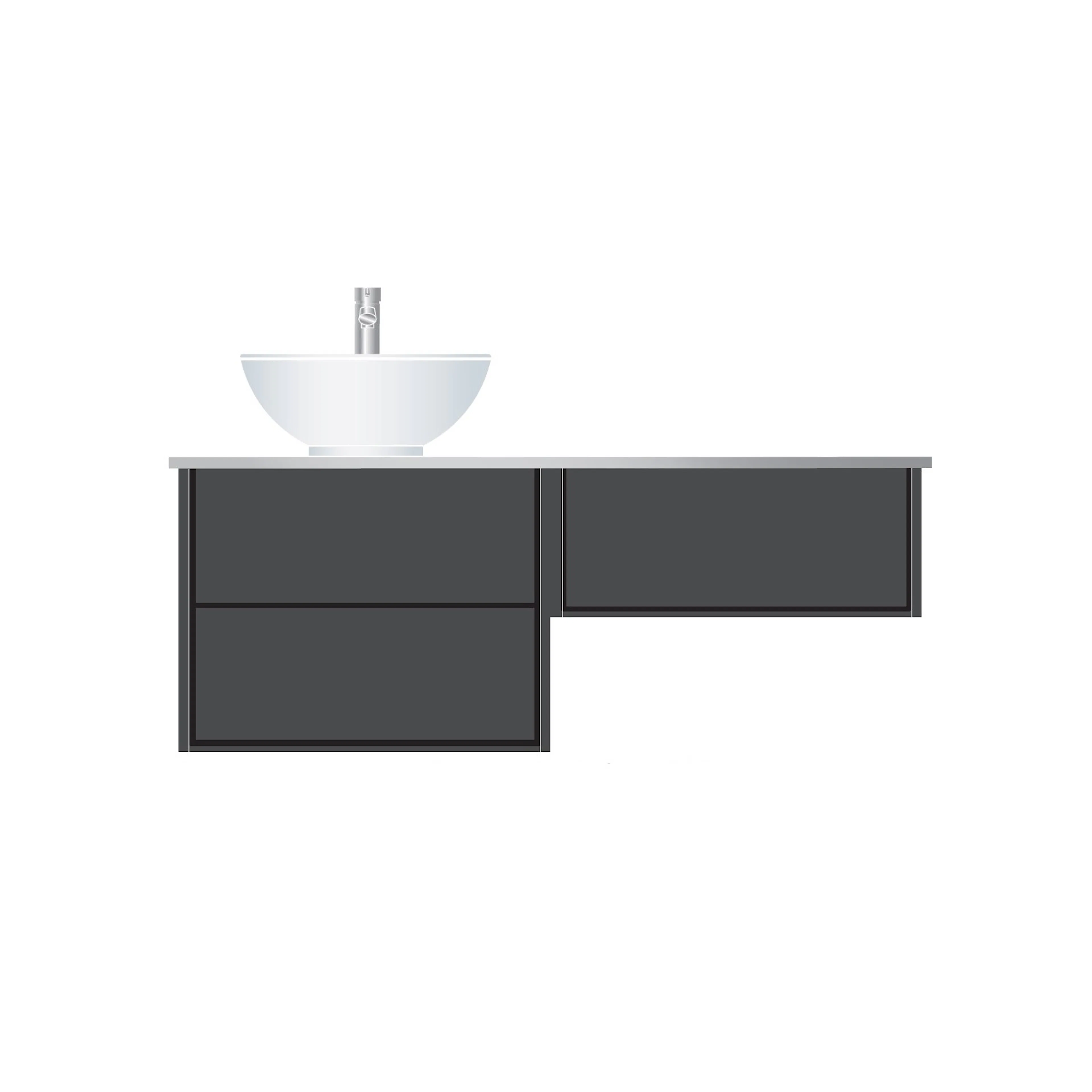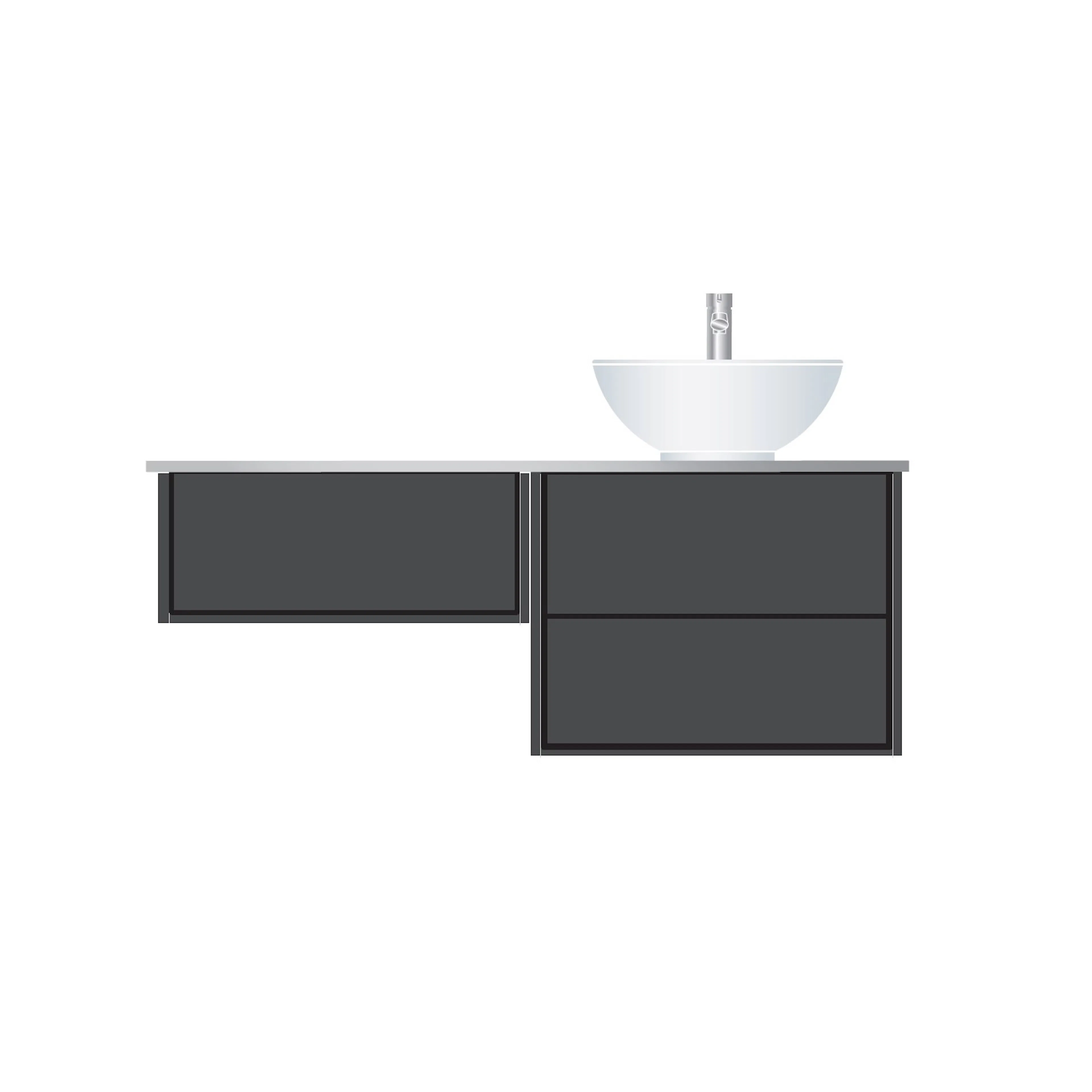 I detta paket ingår ett antracitgrått tvättställsskåp, en antracitgrå sidomodul samt en ljusgrå bänkskiva (Kensho). Bänkskivan har förborrade hål på vänster sida vilket innebär att tvättställsskåpet ska placeras till vänster om sidomodulen.