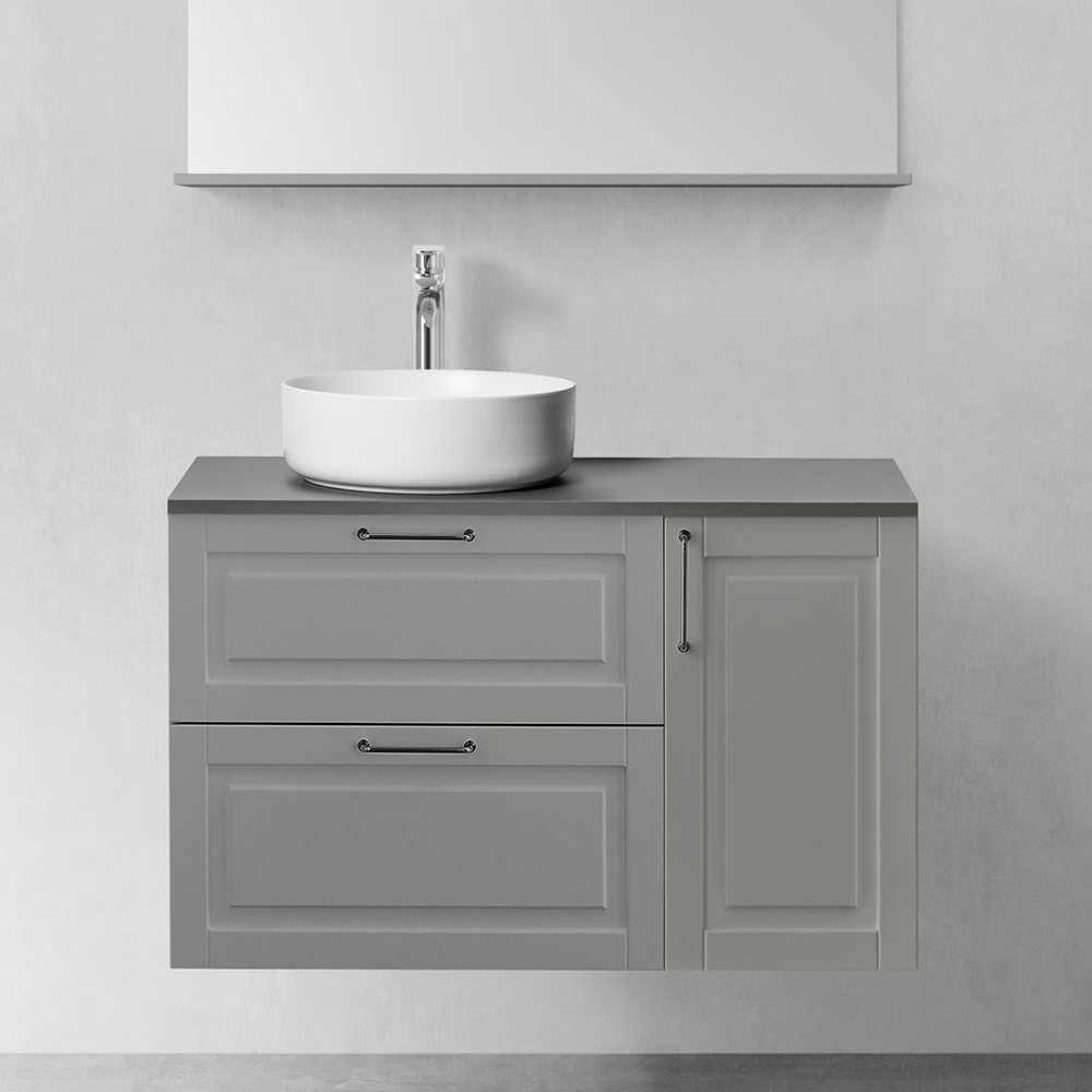 Välj handtag eller knopp som passar din stil och komplettera med fristående handfat på en bänkskiva eller nedsänkt tvättställ i porslin. Köp till blandare, bottenventil, vattenlås, lådbelysning och eluttag.
