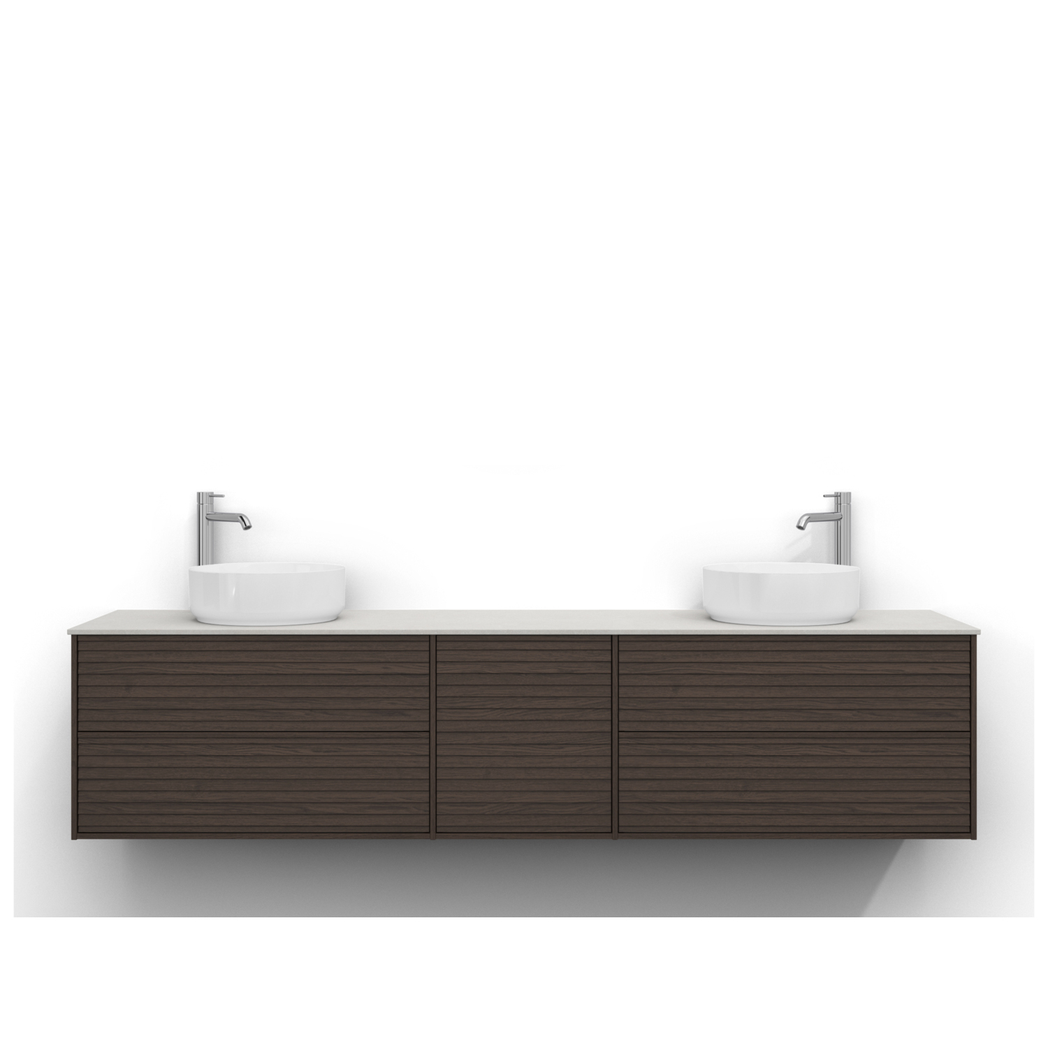 Det generösa formatet ger plats för dubbla tvättställ och gott om förvaring, samtidigt som träets naturliga variation skapar en exklusiv helhet. Ett badrum med rymd, funktion och stil.