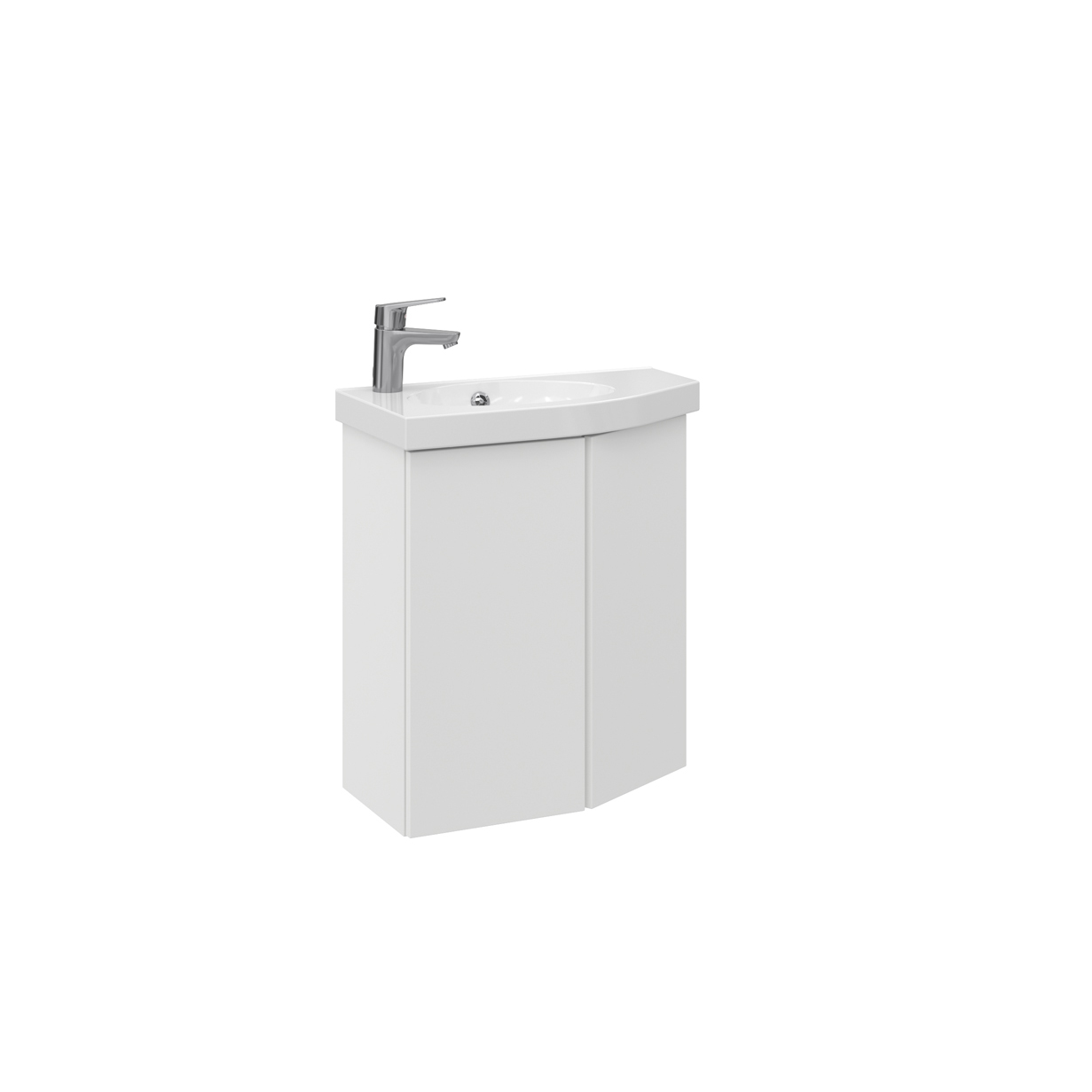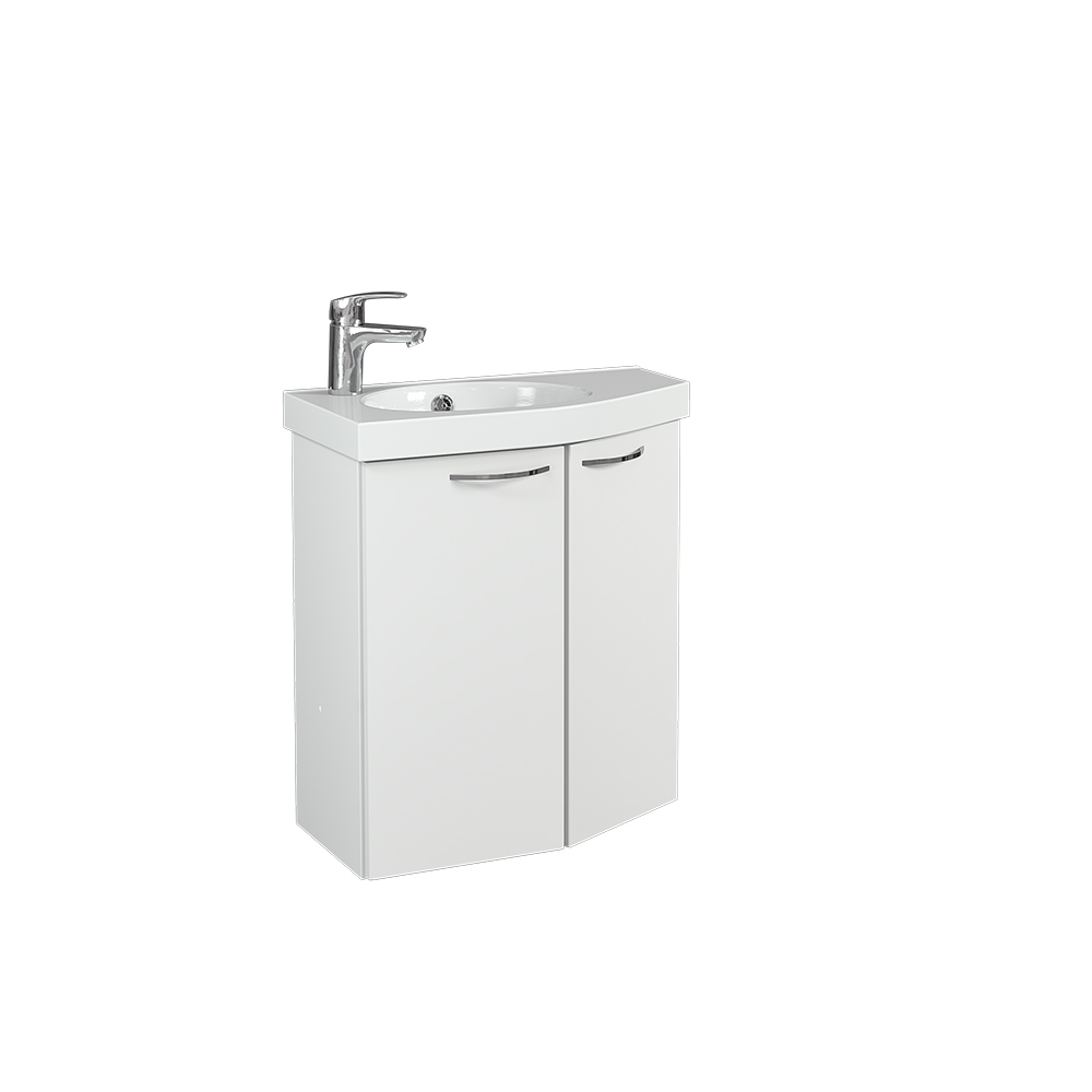 Bakom tvättställsskåpets luckor finns en justerbar hylla och gott om förvaring. Välj mellan olika storlekar och avsmalnande hörn på höger eller vänster sida.