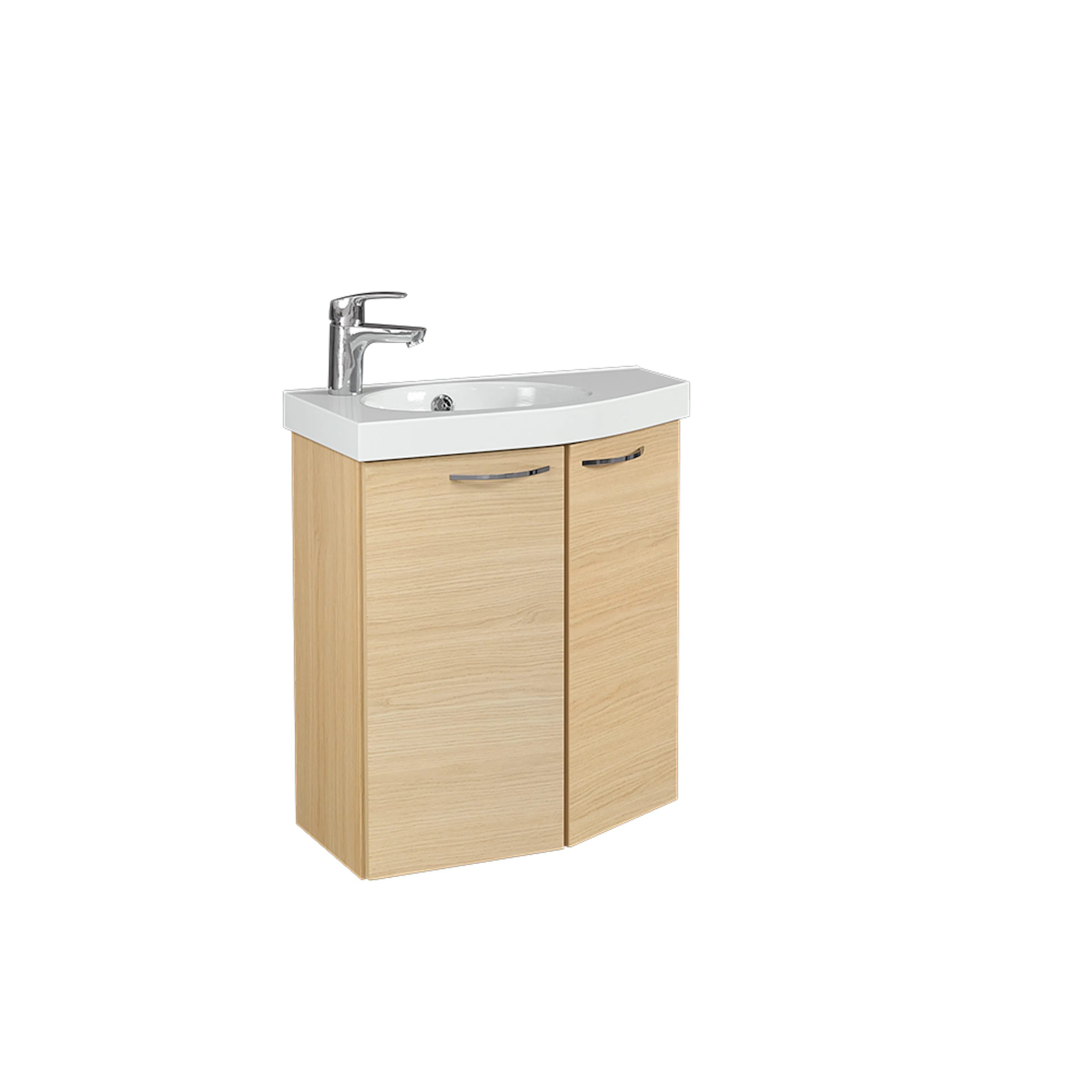 Bakom tvättställsskåpets luckor finns en justerbar hylla och gott om förvaring. Välj mellan olika storlekar och avsmalnande hörn på höger eller vänster sida.