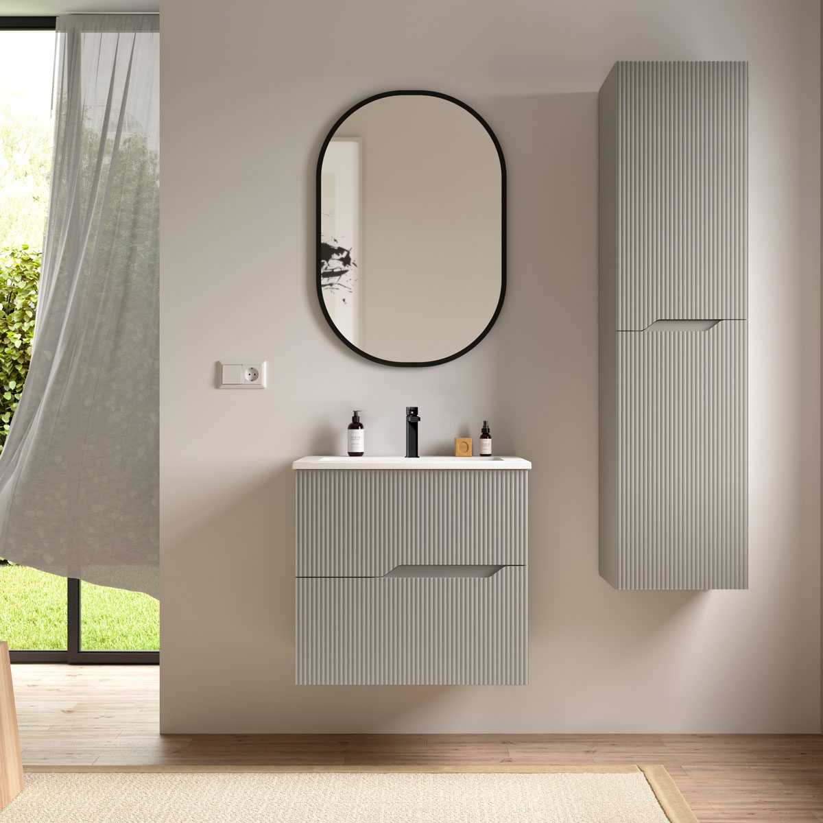 För att ge en svävande och minimalistisk känsla har kommoden dold upphängning, vilket skapar ett rent och avskalat intryck där golvytan frigörs. Denna designfunktion ger badrummet ett luftigare uttryck och gör det dessutom lättare att städa under möbeln.