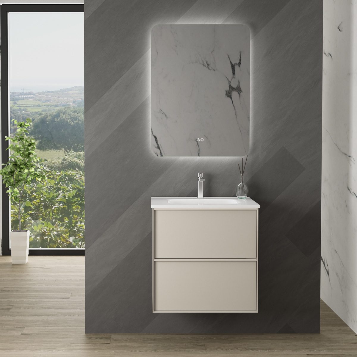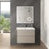Kommoderna i serien finns i två bredder, 60 cm och 80 cm, vilket ger flexibilitet för olika badrumsstorlekar. Med ett djup på 46 cm och en höjd på 59 cm erbjuder de tillräckligt med förvaringsutrymme utan att dominera rummet. De är utrustade med två rymliga lådor med mjukstängande mekanismer, vilket gör dem både praktiska och tystgående. Lådornas greppkanter, tillverkade i samma material och finish som resten av möbeln, bidrar till en enhetlig och modern look.