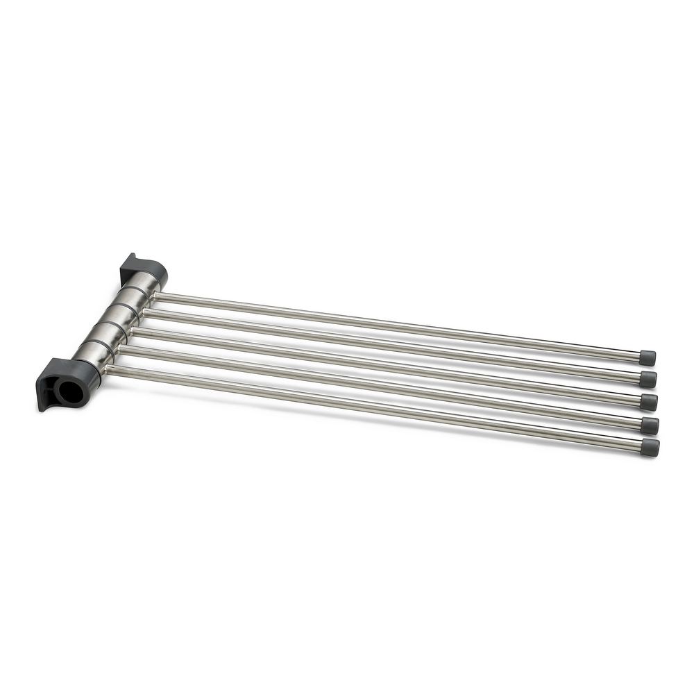 Handdukshängare HO-5 5-Arm från Habo är en handdukshängare av stål med 5-armar. Den levereras med fästen av hårdplast med svängbara armar, 10 mm i diameter med plastbussning i ändan. Utsprång infälld 40 mm och maximalt utfälld 500 mm.