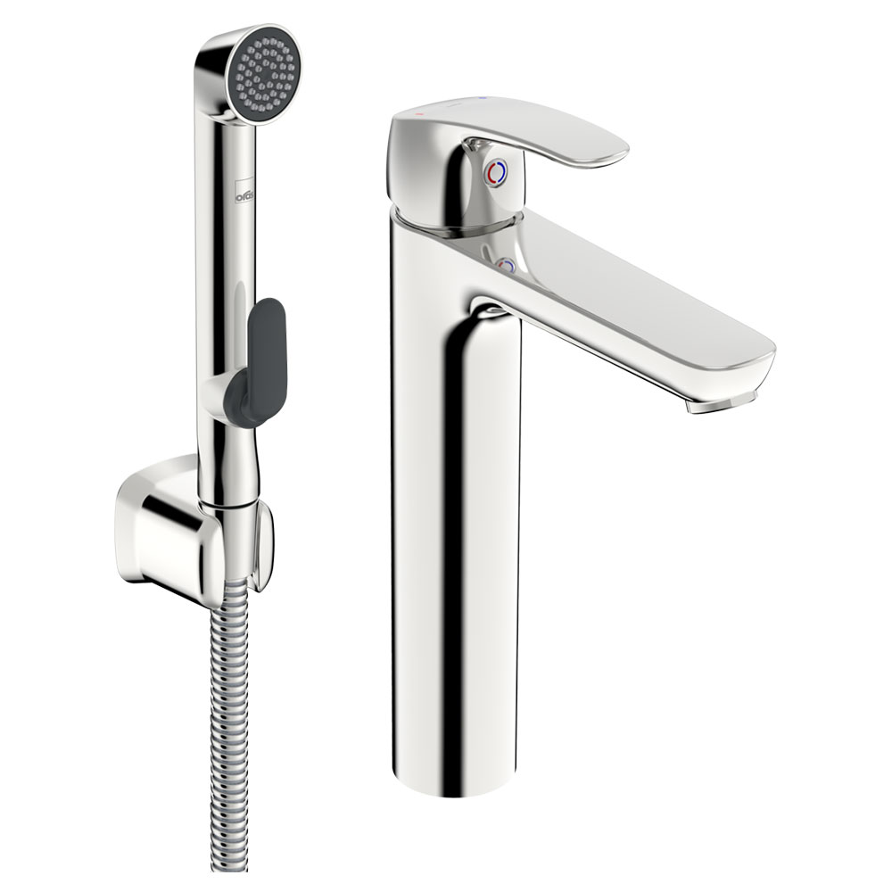 Tvättställsblandare Oras Safira 1002F i krom är en ettgreppsblandare med fast utloppspip, strålsamlare och bidetta handdusch. Duschslang, 1750 mm och väggfäste ingår.