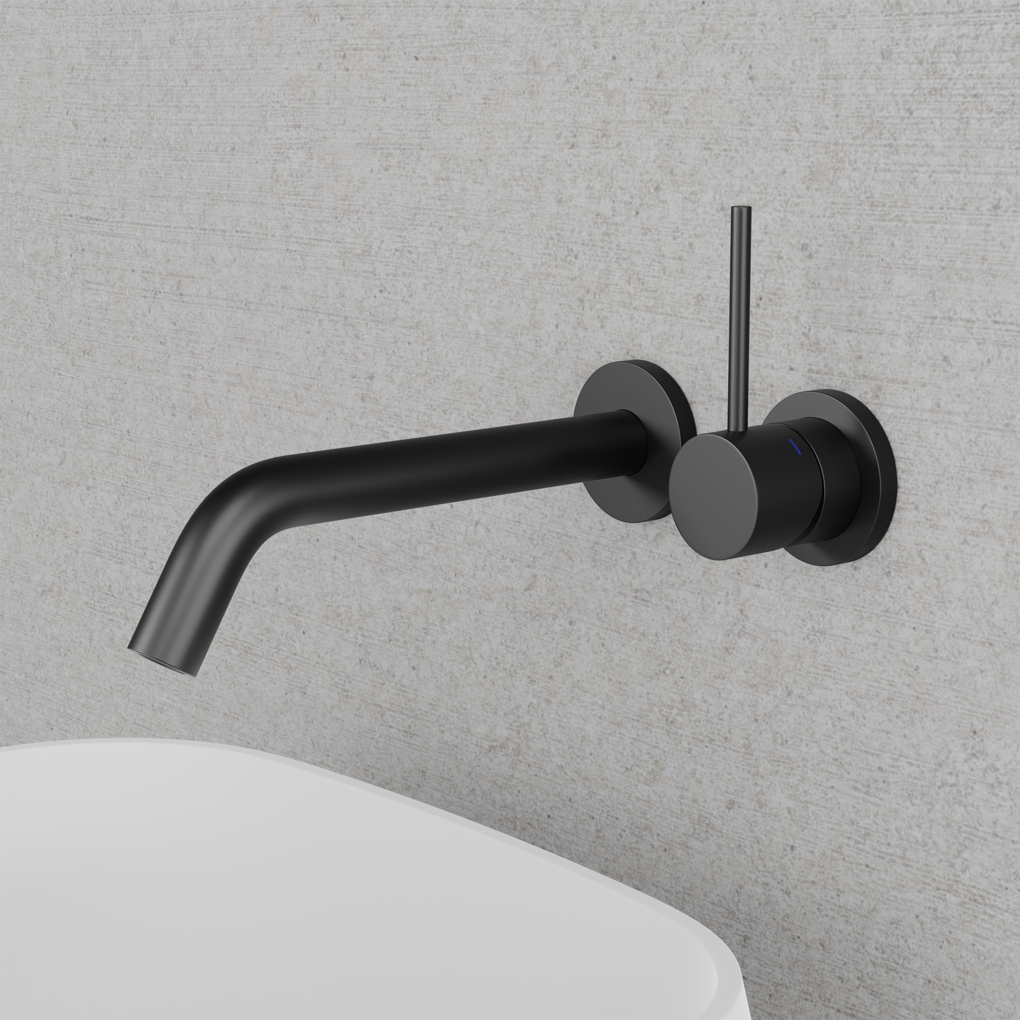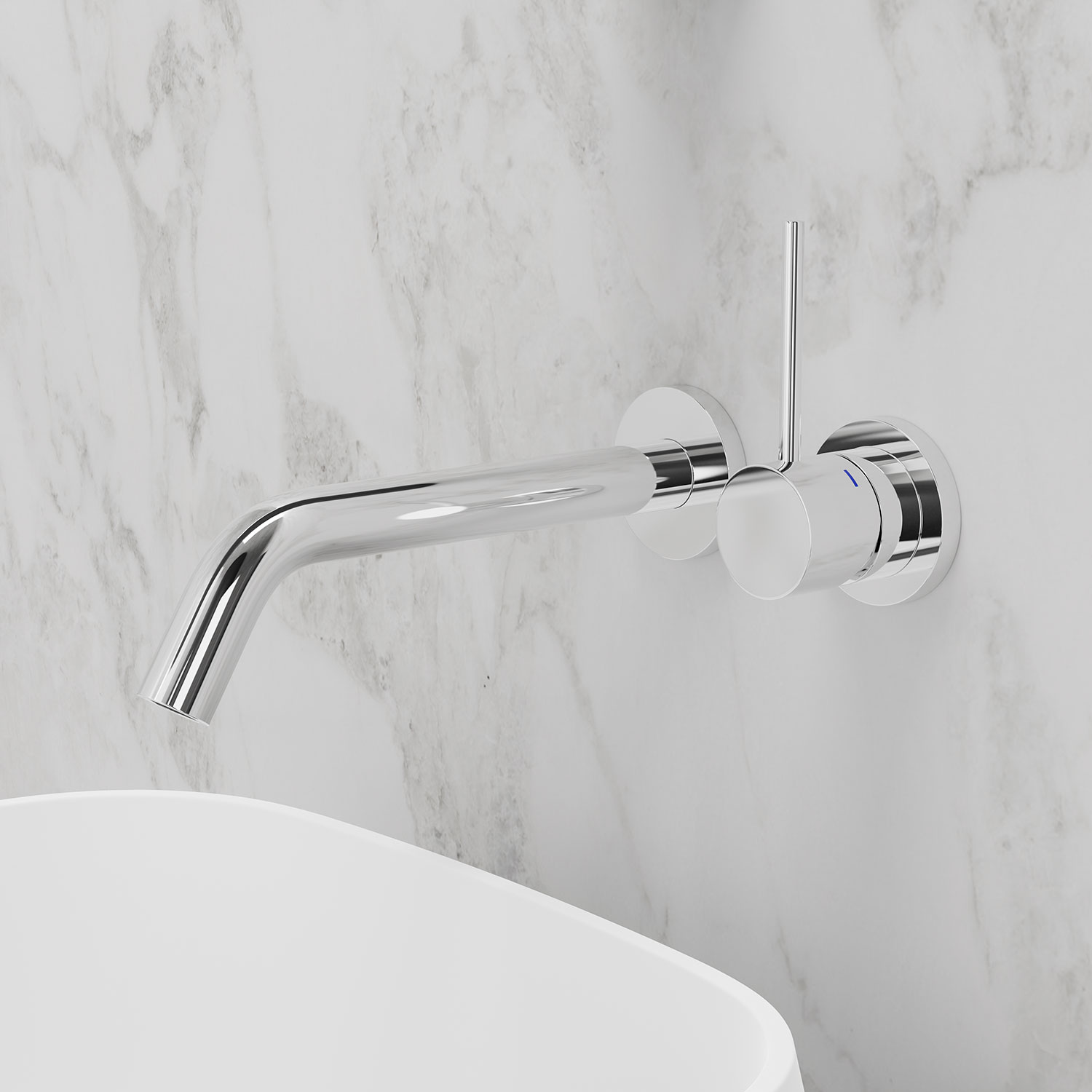 Dold montering bakom vägg ger badrummet ett luftigt intryck. Stilren kompromisslös formgivning i minimalistisk tappning. Passar utmärkt för både nedsänkt och fristående tvättställ.
