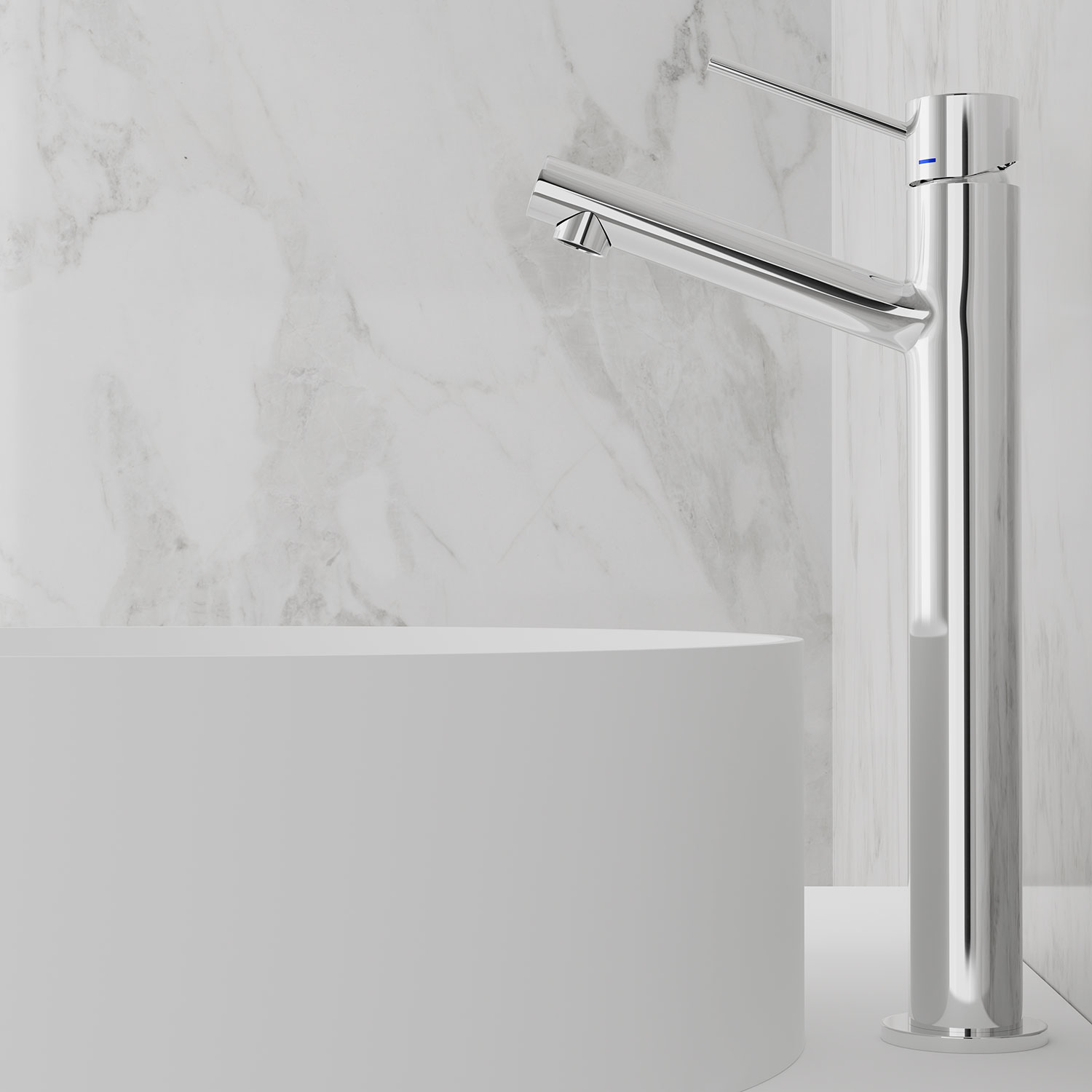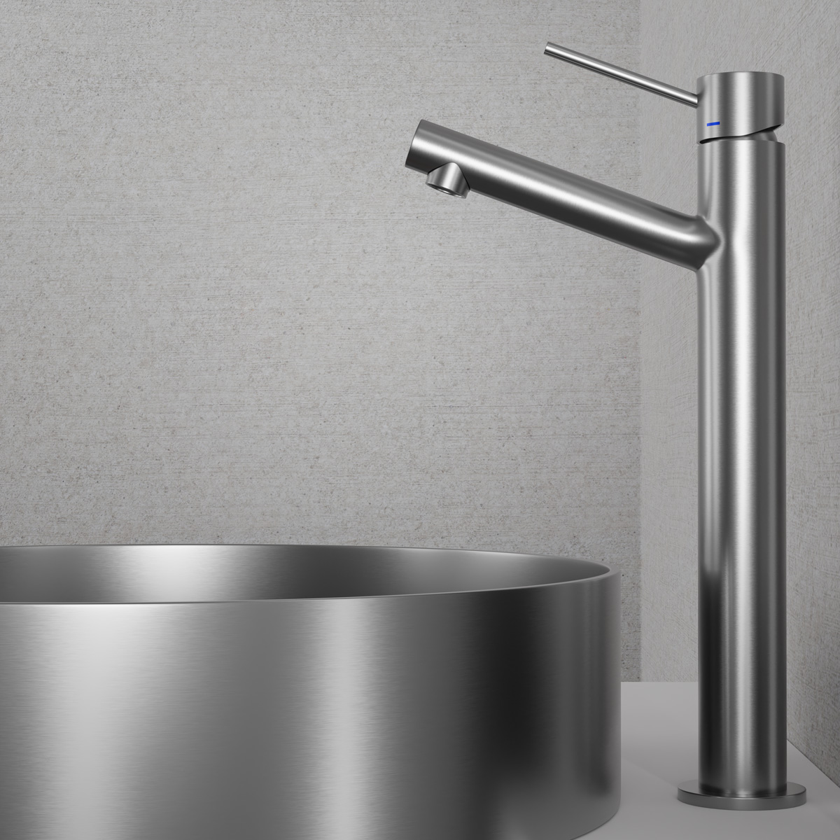 Tvättställsblandare Scandtap Steel Vector High är en högre, stilren tvättställsblandare i rostfritt stål och slimmad design med moderna inslag. Formgiven med diagonala linjer och i minimalistisk tappning. En hög modell utan skarv som passar utmärkt till fristående tvättställ. Försedd med kvalitativa komponenter som sparar vatten och bibehåller ett perfekt anpassat vattenflöde. Neoperl anslutningsslang med 10 mm slät ända.