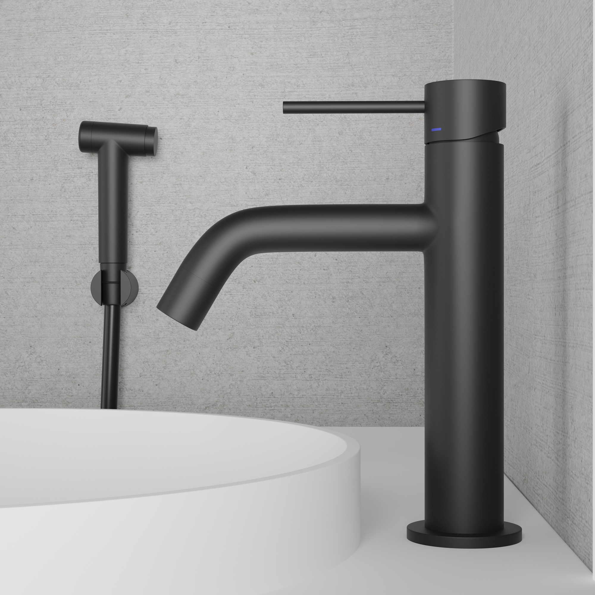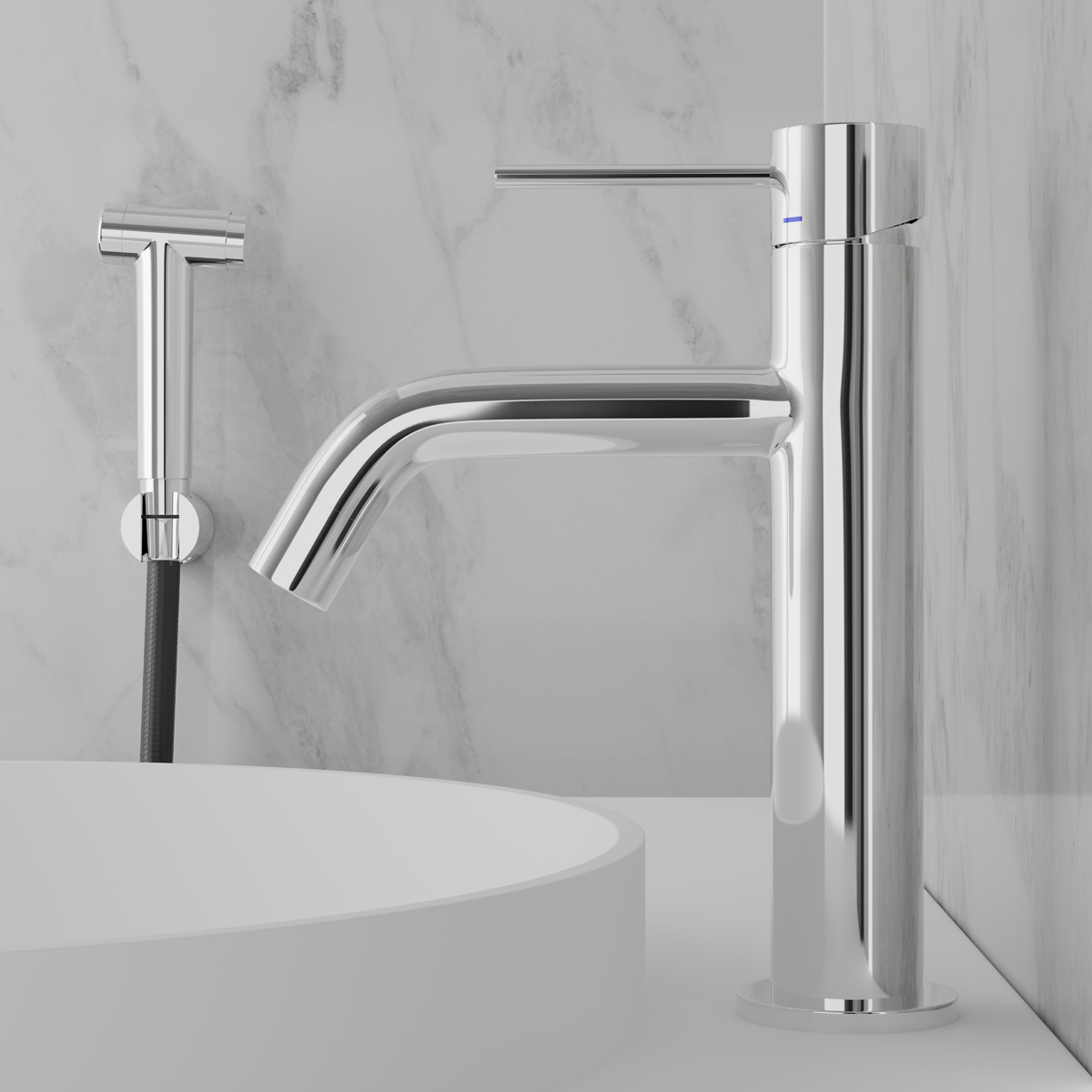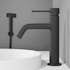 Tvättställsblandare Scandtap Steel Voyage Medium med Siodusch - samma stilrena design som Voyage, utrustad med ett bidetmunstycke i rostfritt stål.