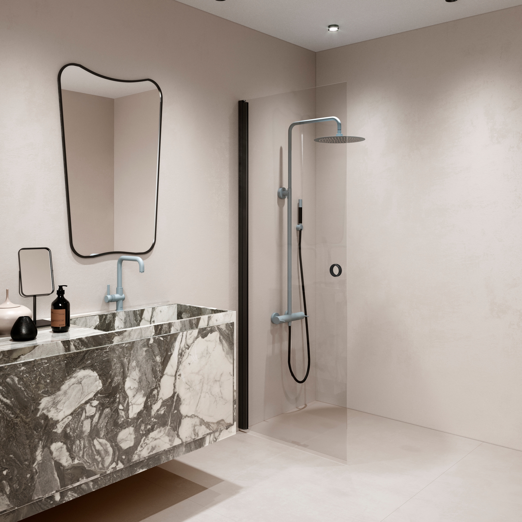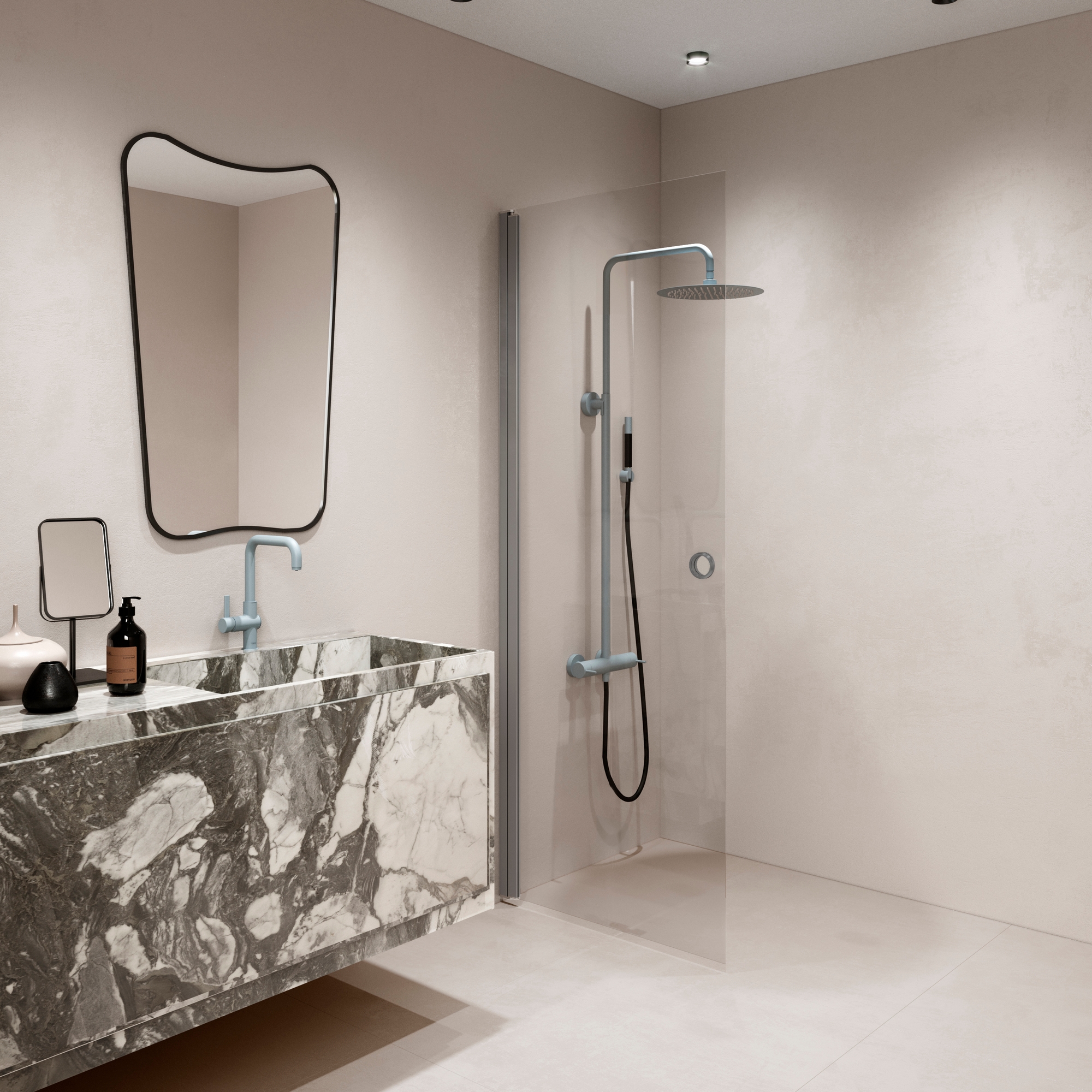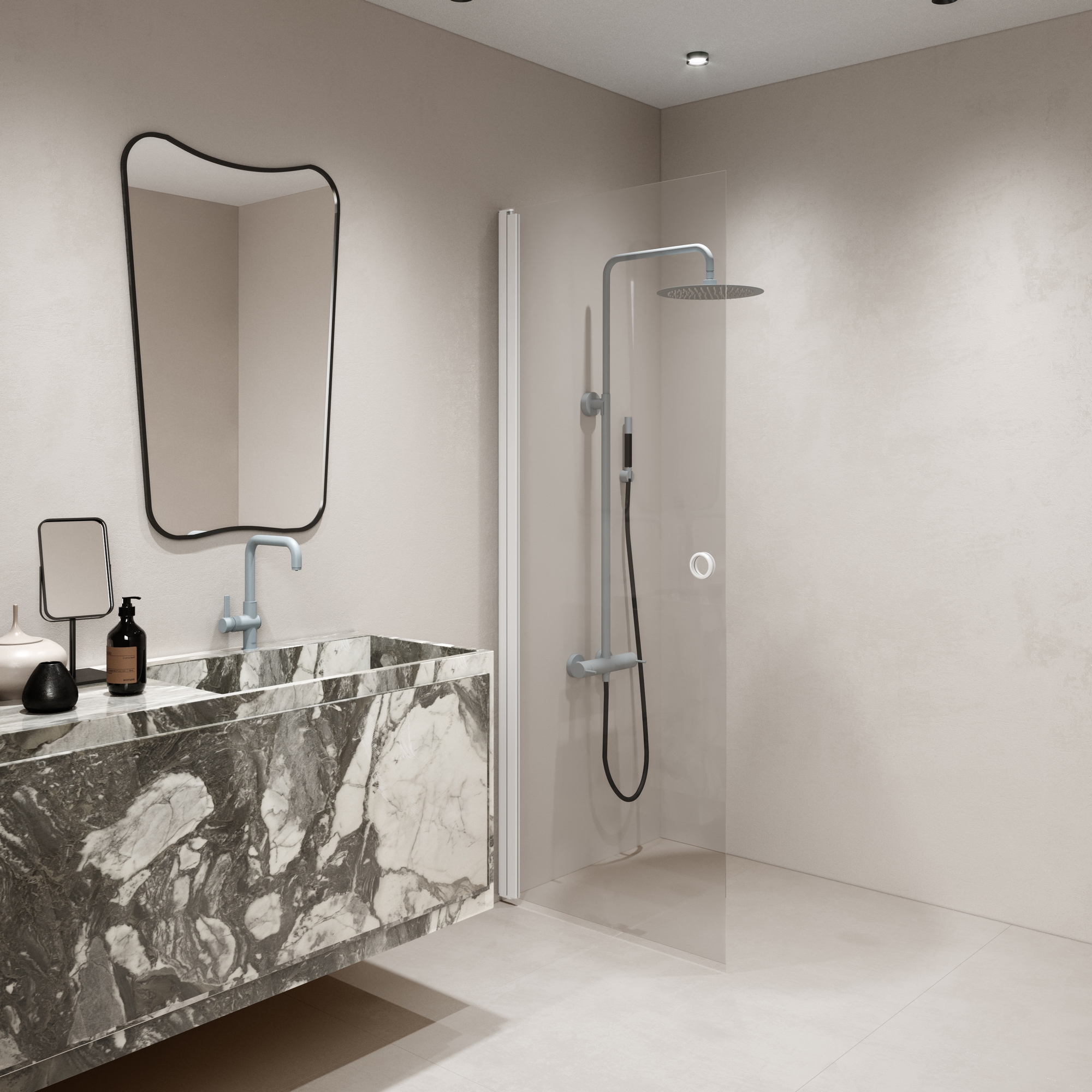 När duschen inte används kan duschdörren vändas mot väggen. Duschdörren vänds 90 grader i bägge riktningarna och förses med justerbar centrering. Centreringen strävar efter att återställa duschväggen till öppen respektive stängd position. Dörren är försedd med lyftgångjärn.