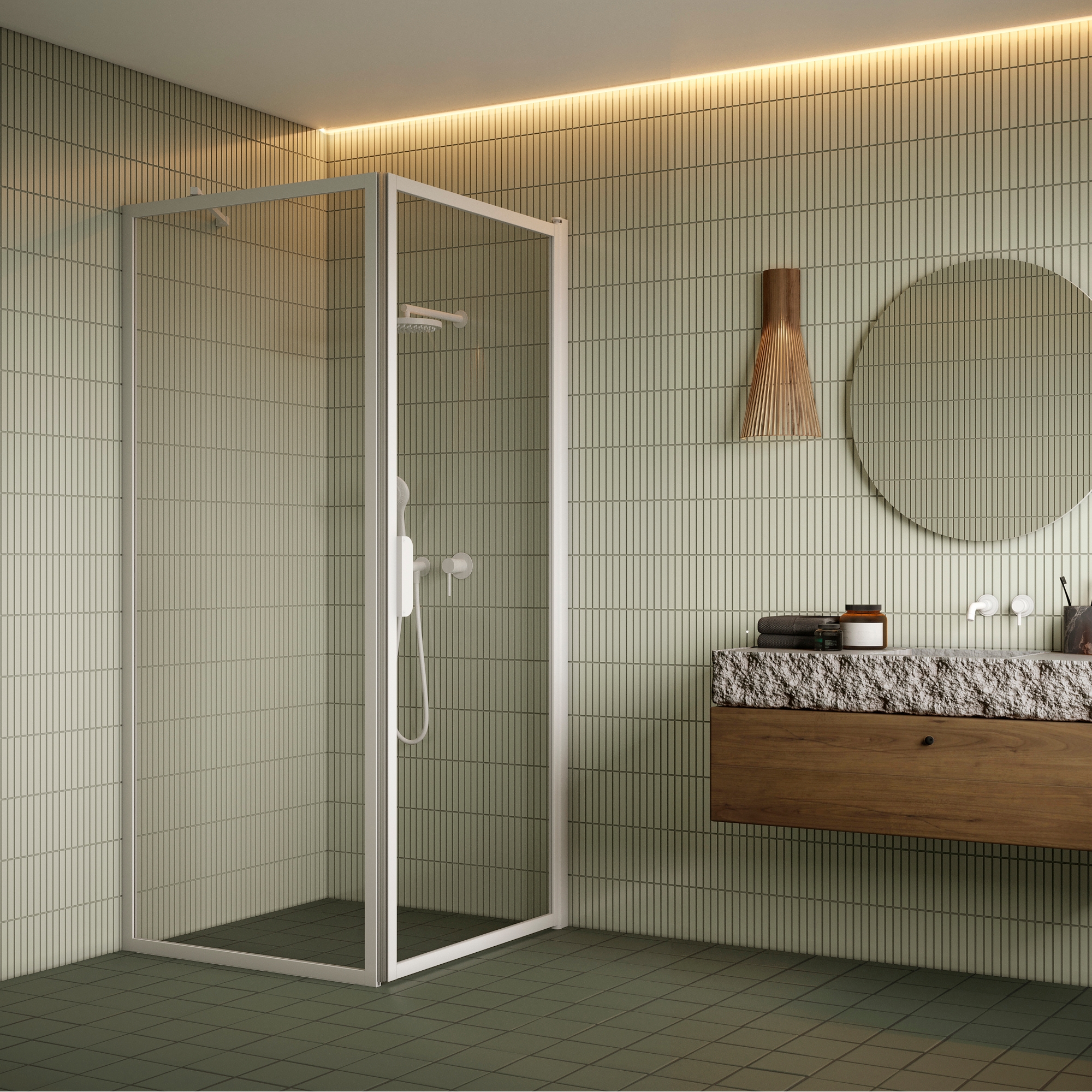 Den fasta duschväggen är fastsatt på väggfästena med självborrande skruvar. Dörrpanelen är monterad på andra sidan av utrymmet med väggfästen. Stödstången sätts upp från den övre kanten av den fasta panelen och skruvas in i byggnadens vägg. Magnettätningar installeras på varje dörrpanel för att hålla dörren tätt stängd. Sockeltätning kan fästas på panelerna och en tröskelprofil kan installeras under dörrpanelerna för att förbättra vattentätningen.