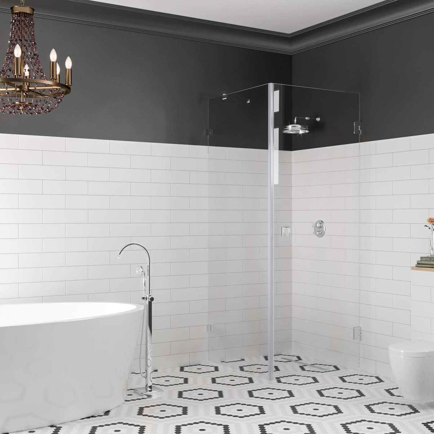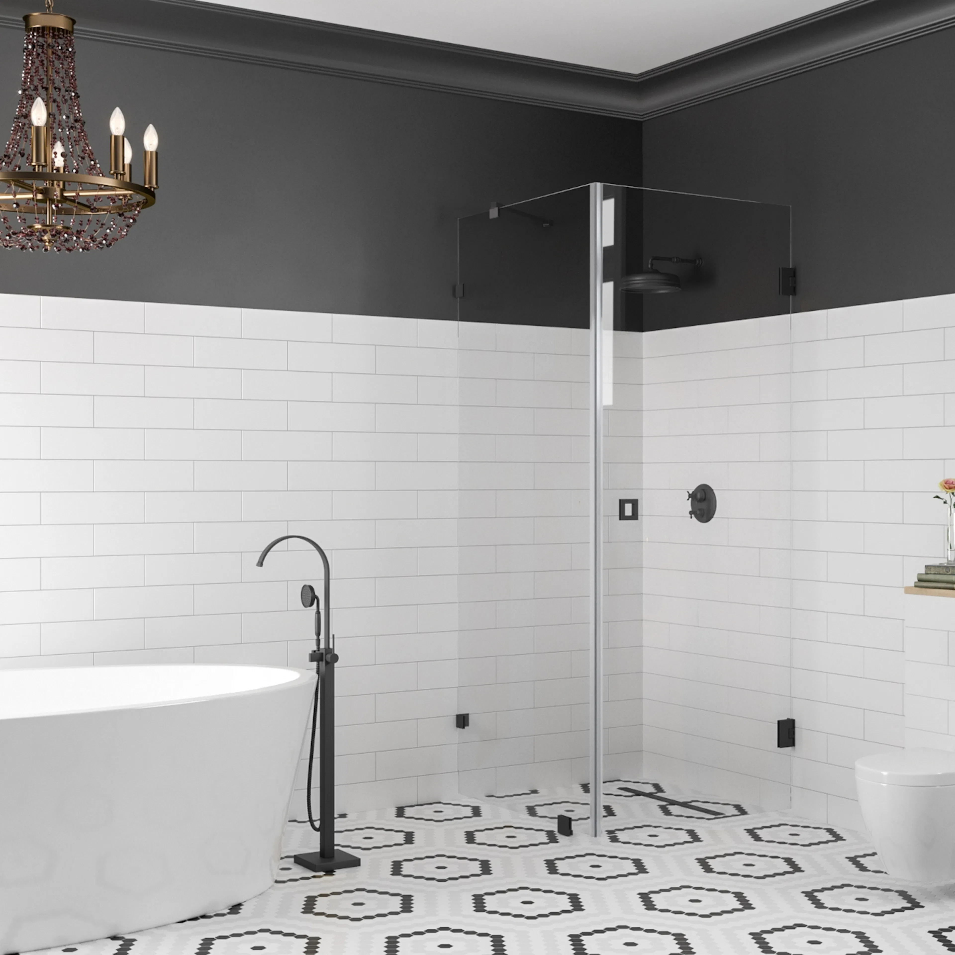 Den fasta väggen förses med golvbeslag som monteras i golvet och ett sidostag vars position kan väljas fritt mot väggen. Som standardutrustning sockeltätning. Istället för det sneda sidostaget, kan man välja duschväggen med ett långt sidostag, som installeras i 90 graders vinkel och kan väljas som tillval vid beställningen.