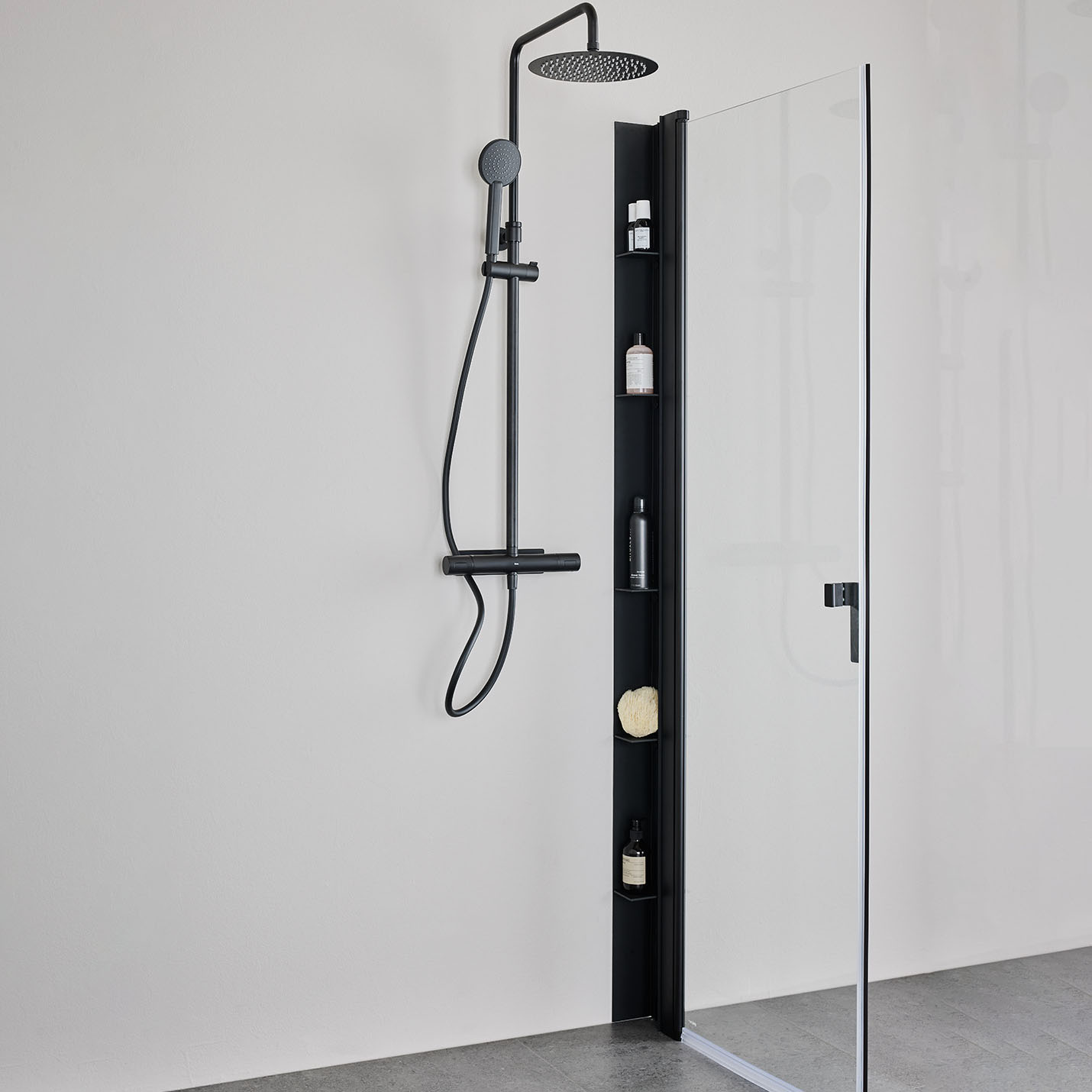Duschhylla Place skapar mycket förvaring i duschen för alla flaskor och prylar samtidigt som den skapar visuell harmoni genom att hålla dem utom synhåll – smidigt och snyggt. I duschhyllan finns 5 hyllplan, vilka kan justeras i höjdled. Place monteras mellan vägg och duschvägg eller duschdörr och är 100 mm bred. Det vill säga, om du i ditt badrum skall ha en 90x90 cm duschlösning inklusive Place duschhylla, skall du beställa en 90x80 duschlösning där sidan som är 80cm är den där Place duschhylla monteras.