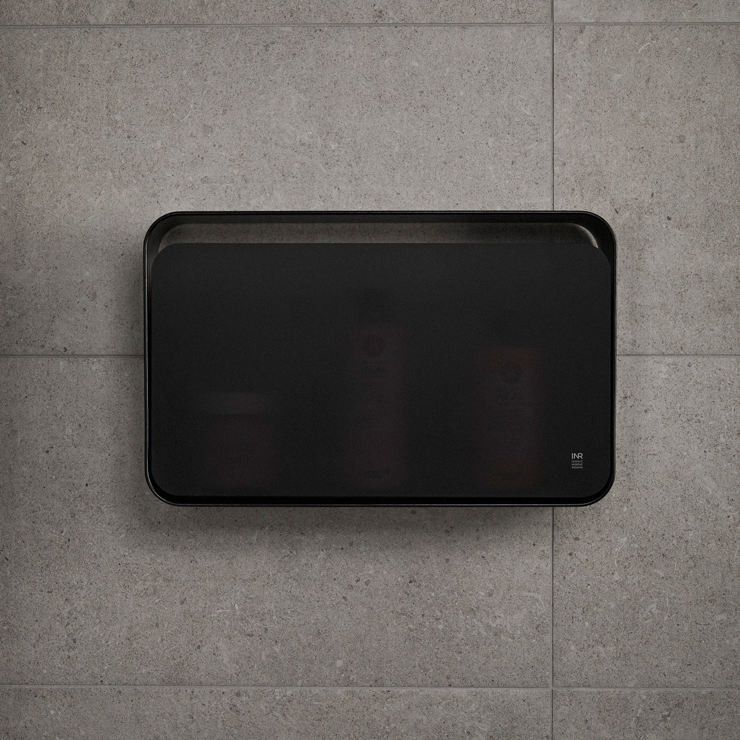 Duschhylla INR Nest är en duschhylla som håller dina flaskor i tryggt förvar på väggen i eller utanför duschen. Vippa ut den frostade luckan för att öppna och få en bra överblick över dina duschprodukter. Hyllan är tillverkad av aluminium vilket gör den både hållbar och lättstädad. Botten är försedd med avrinningshål för enkel rengöring. Den kan skruvas eller limmas upp på väggen.