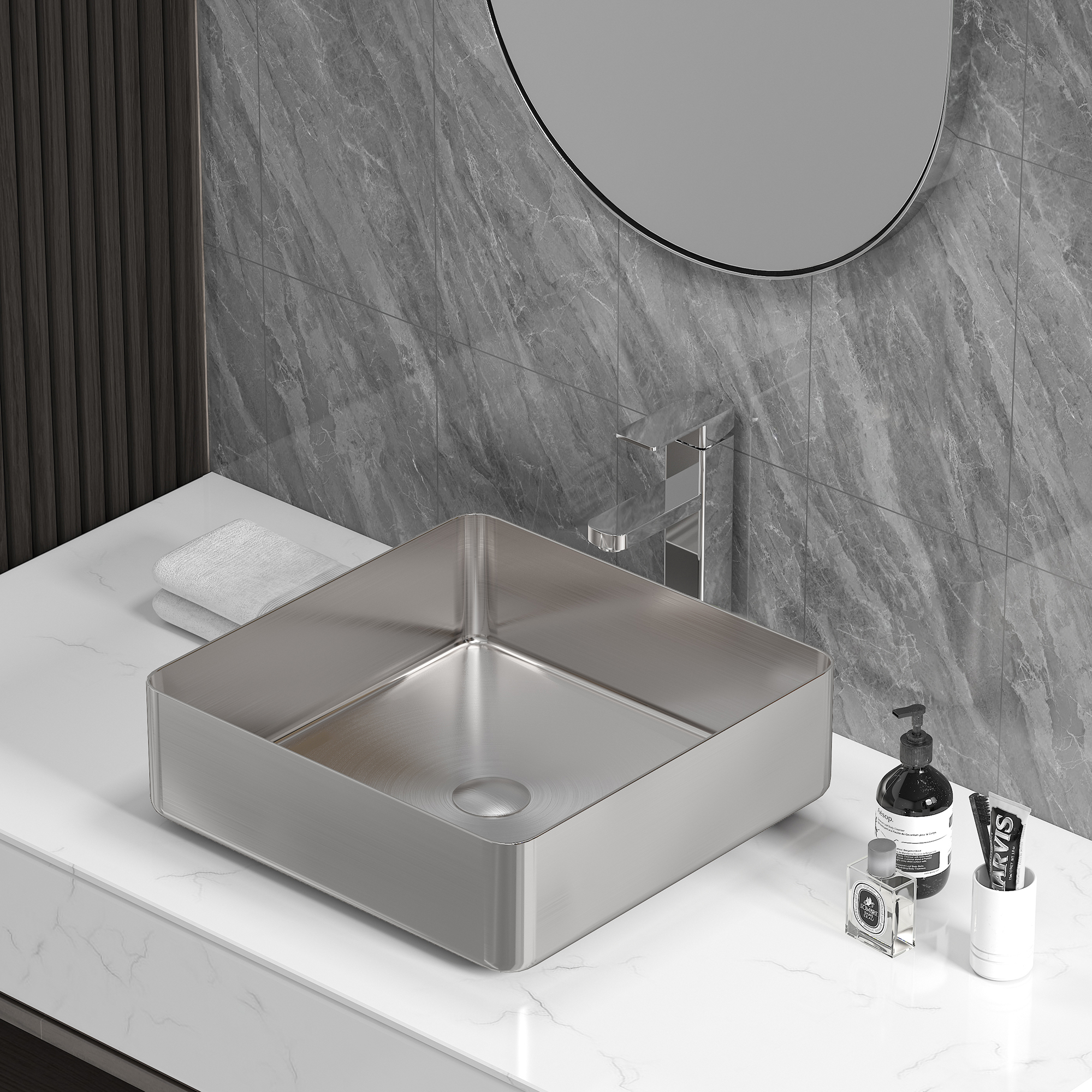 Tvättställ Skatt från Bathlife är ett tunt fristående handfat i rostfritt stål.