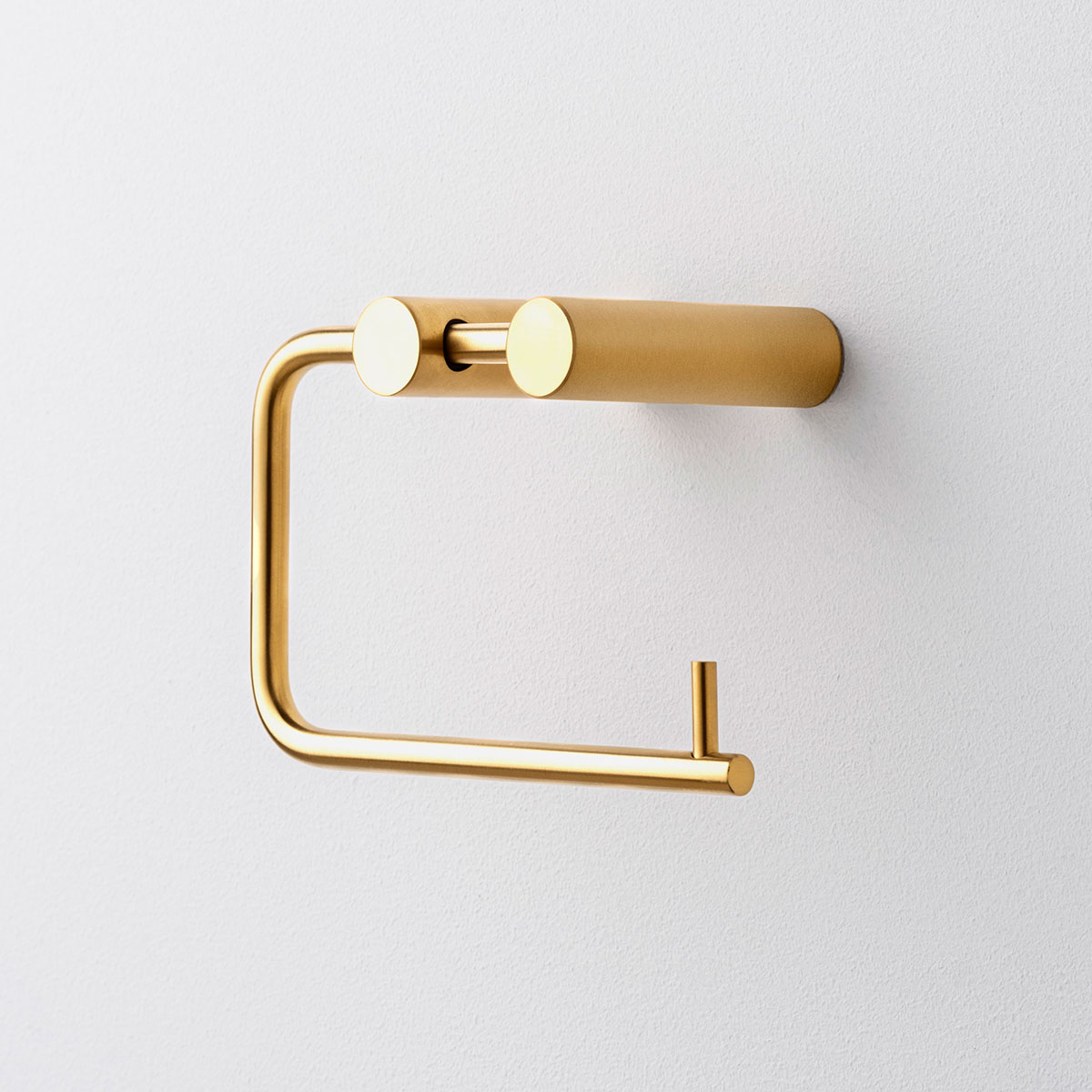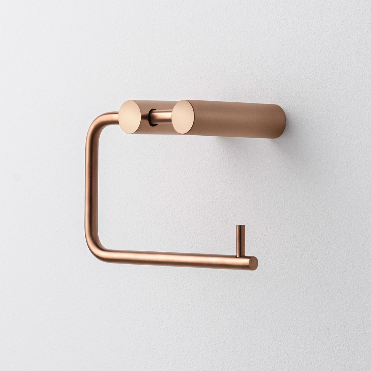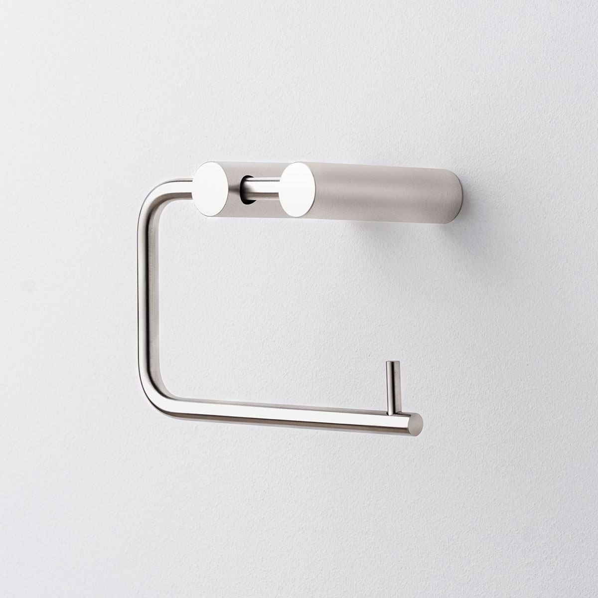 Toalettpappershållare i rostfritt stål som matchar övriga produkter i samma finish.