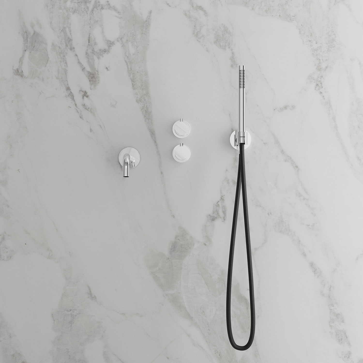 Dold montering bakom vägg ger badrummet ett minimalistiskt och harmoniskt intryck. Inkluderar en cylindrisk handdusch som avger ett mjukt behagligt vattenflöde med bred spridning. Tidlös design som samspelar med ett skandinaviskt formspråk.
