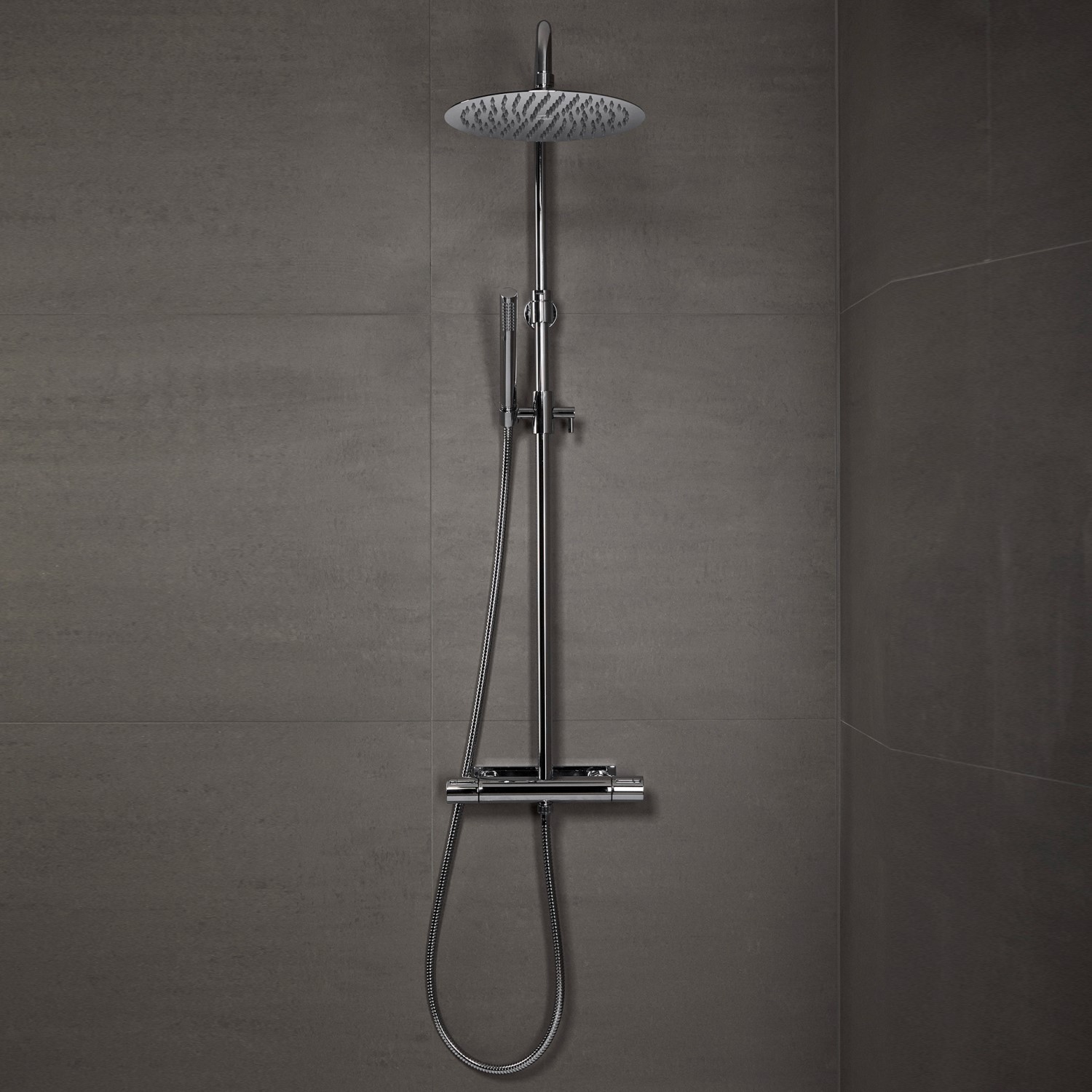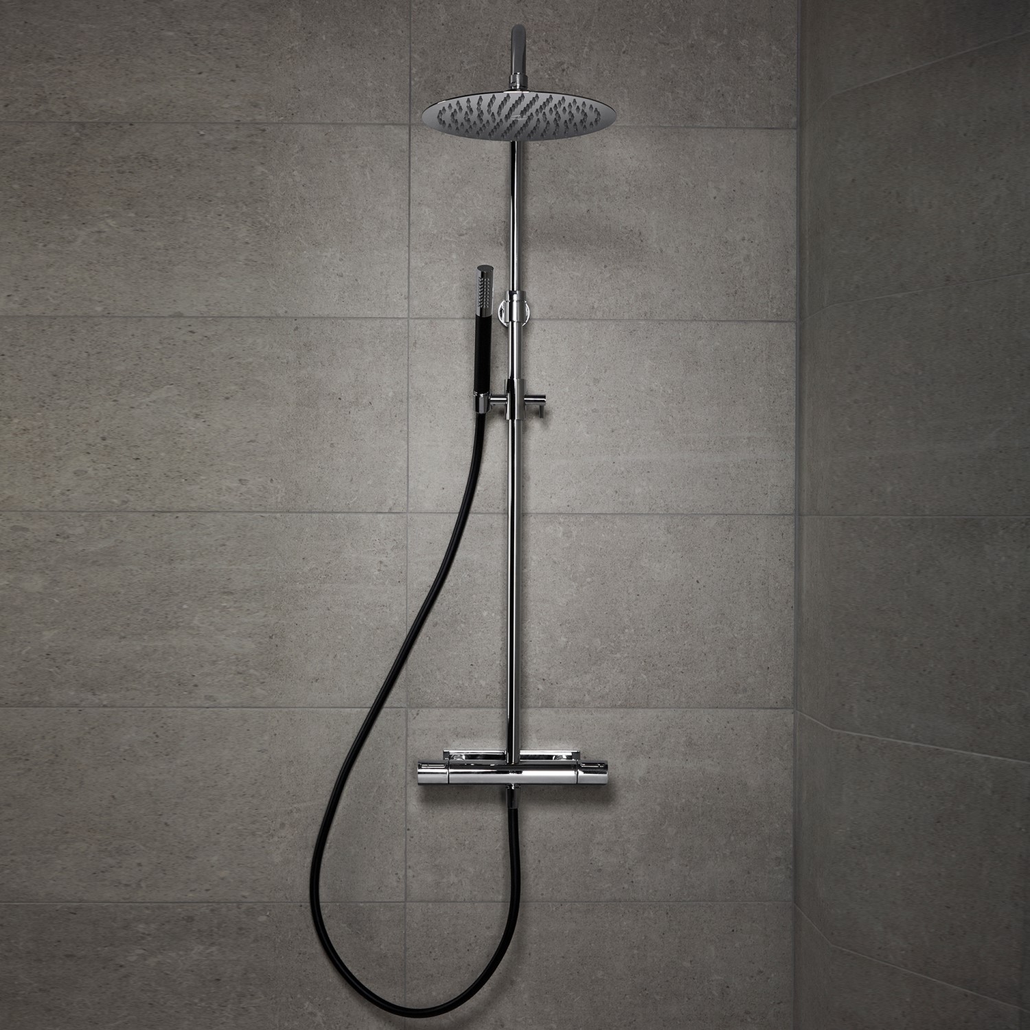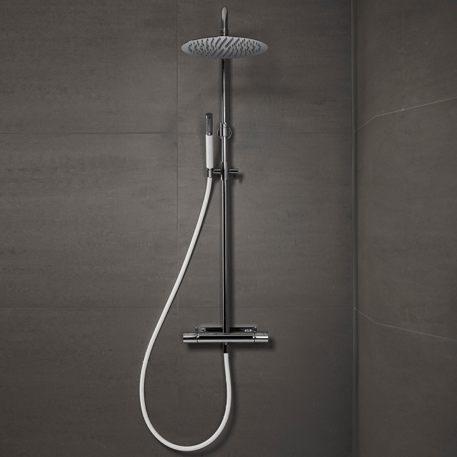 Takduschset Mist från INR är modernt duschset med en rund taksil och en pinnhanddusch. I den smäckra termostatblandaren ryms flera innovativa tekniker, såsom Safe Temp med unik vattentrycks- och temperaturkontroll vilket gör din duschupplevelse extra njutbar samt Eco Flow och Easy Clean som håller både vattenkostnaden och städtiden nere.