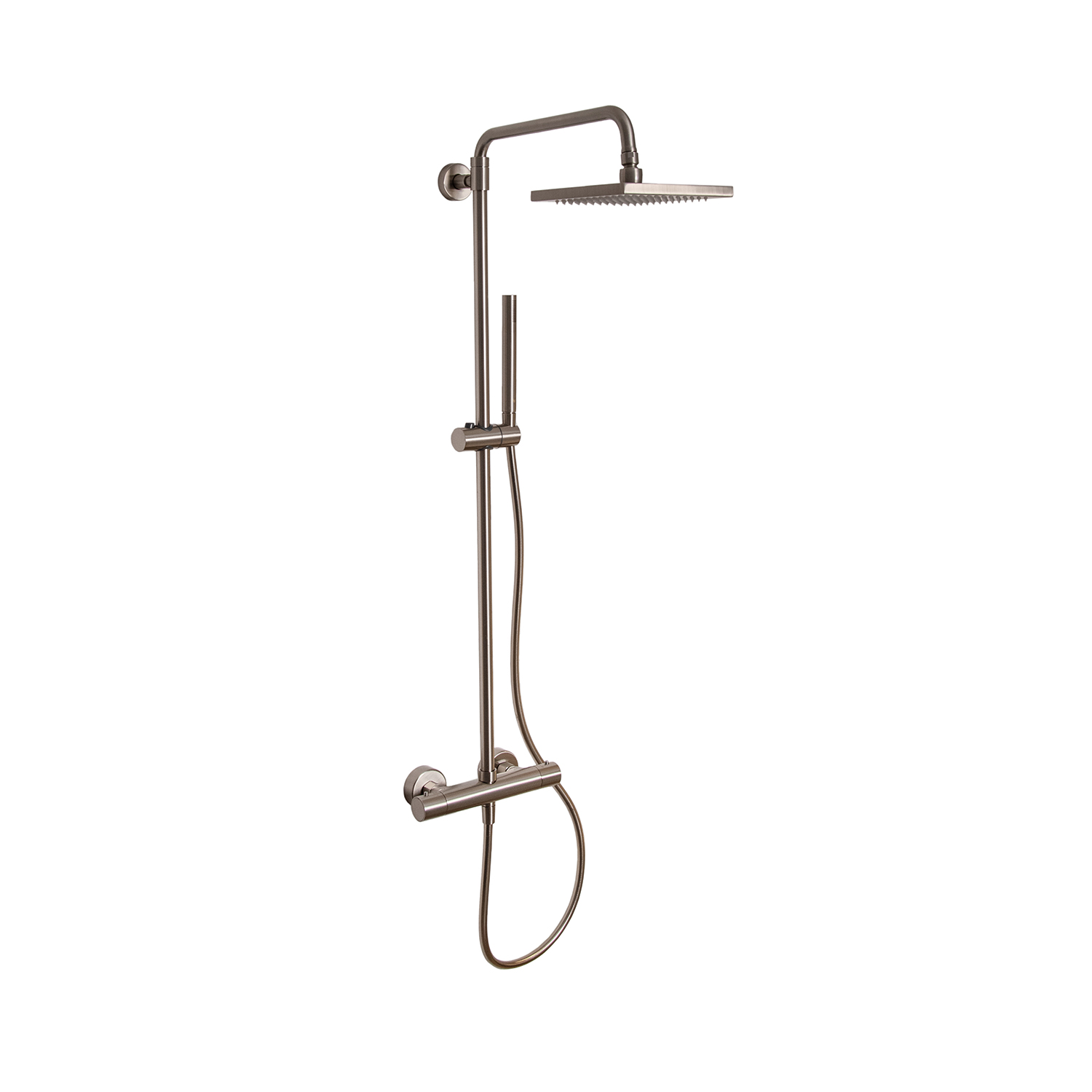 Takduschset LH Turano är ett stilrent duschset med en blandare (cc-mått 150 mm), en fyrkantig takdusch (200x200 mm), en elegant pinnhanddusch samt duschslang och duschstång. En justermån på 550 mm gör det möjligt att passa in duschen för olika takhöjder. Med detta moderna duschset kan du njuta av en avslappnande och uppfriskande dusch. Finns i flera olika ytbehandlingar.