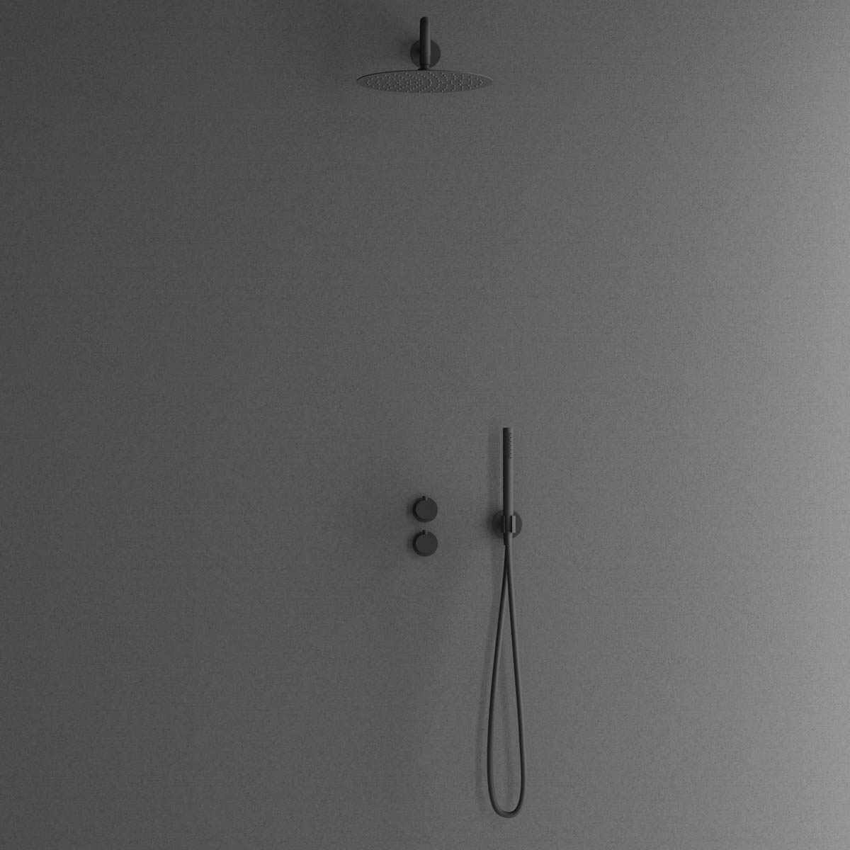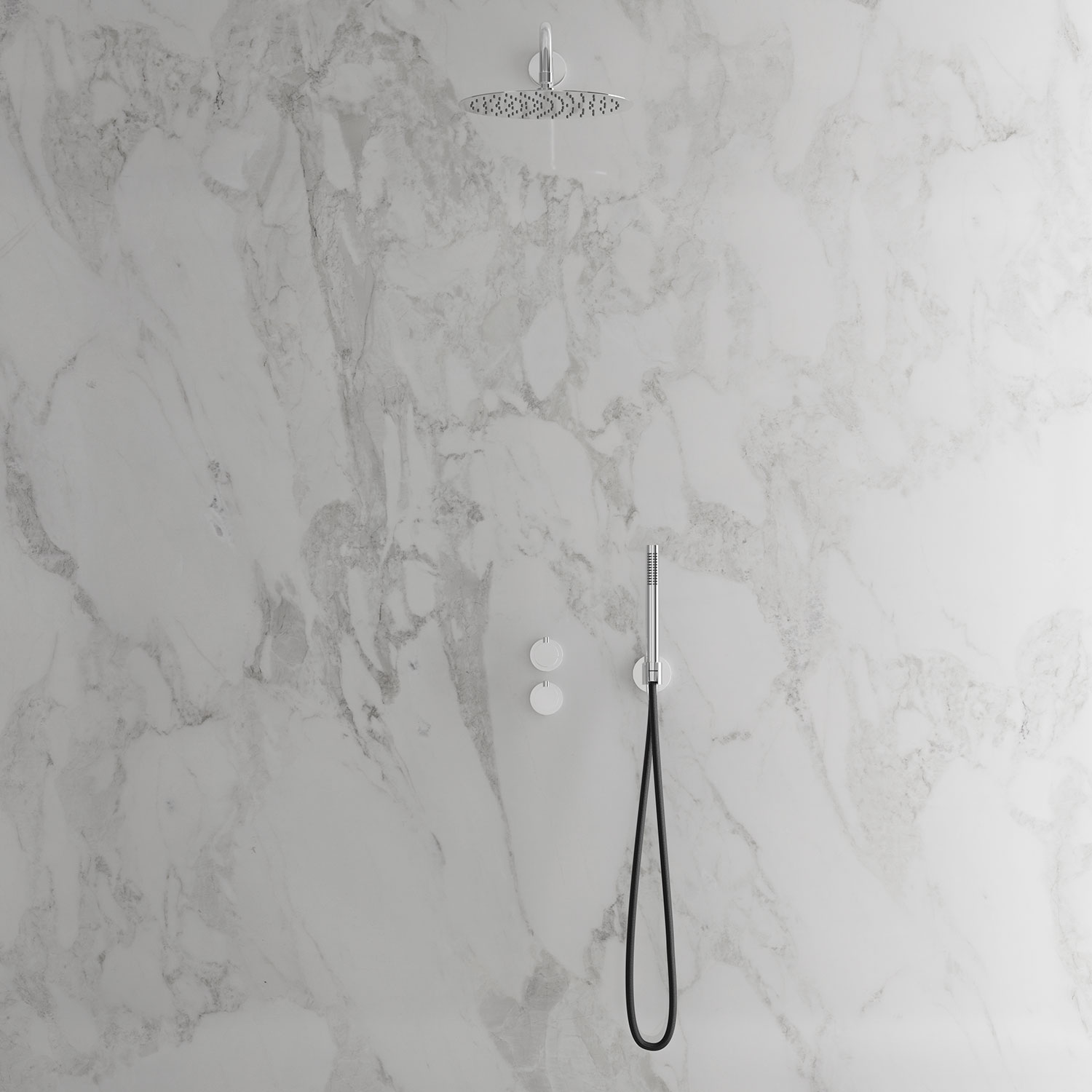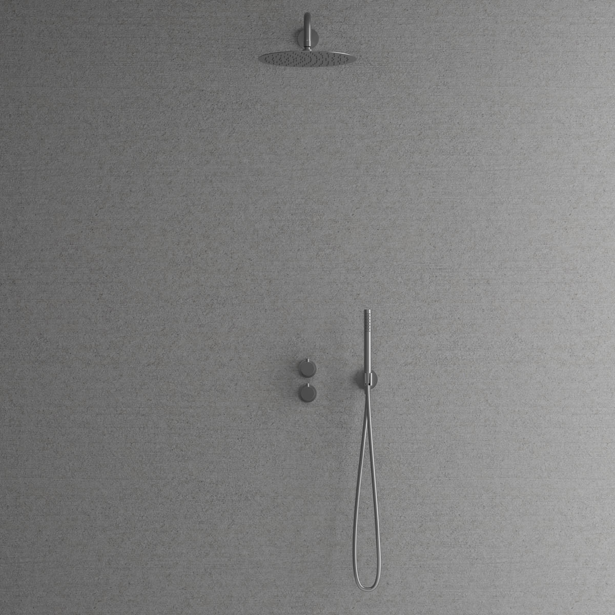 Takduschset Scandtap Steel Harmonized 2X är en termostatblandare för inbyggnad med eleganta slimmade detaljer.
