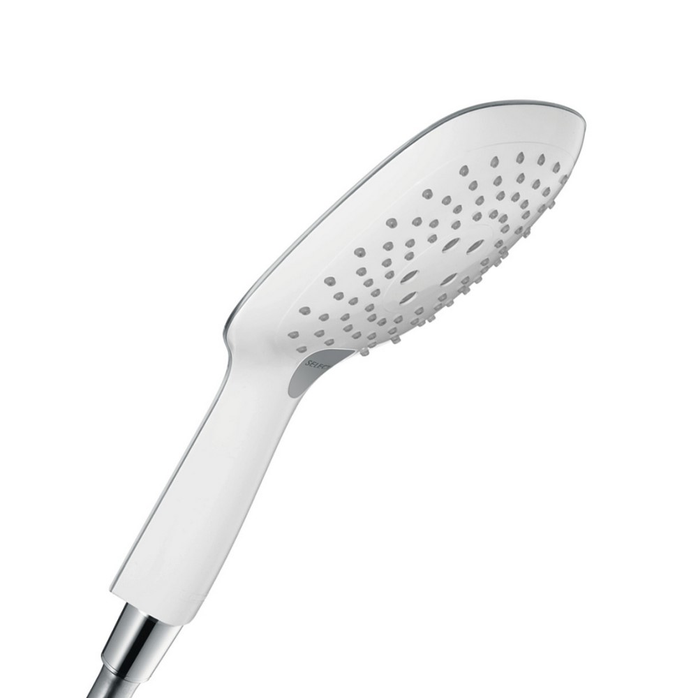 Handdusch Raindance Select från Hansgrohe är en modern handdusch med en konstruktion med två skal. Handduschen har tre stråltyper: RainAir, CaresseAir och Mix, som du enkelt byter mellan med Select-knappen.