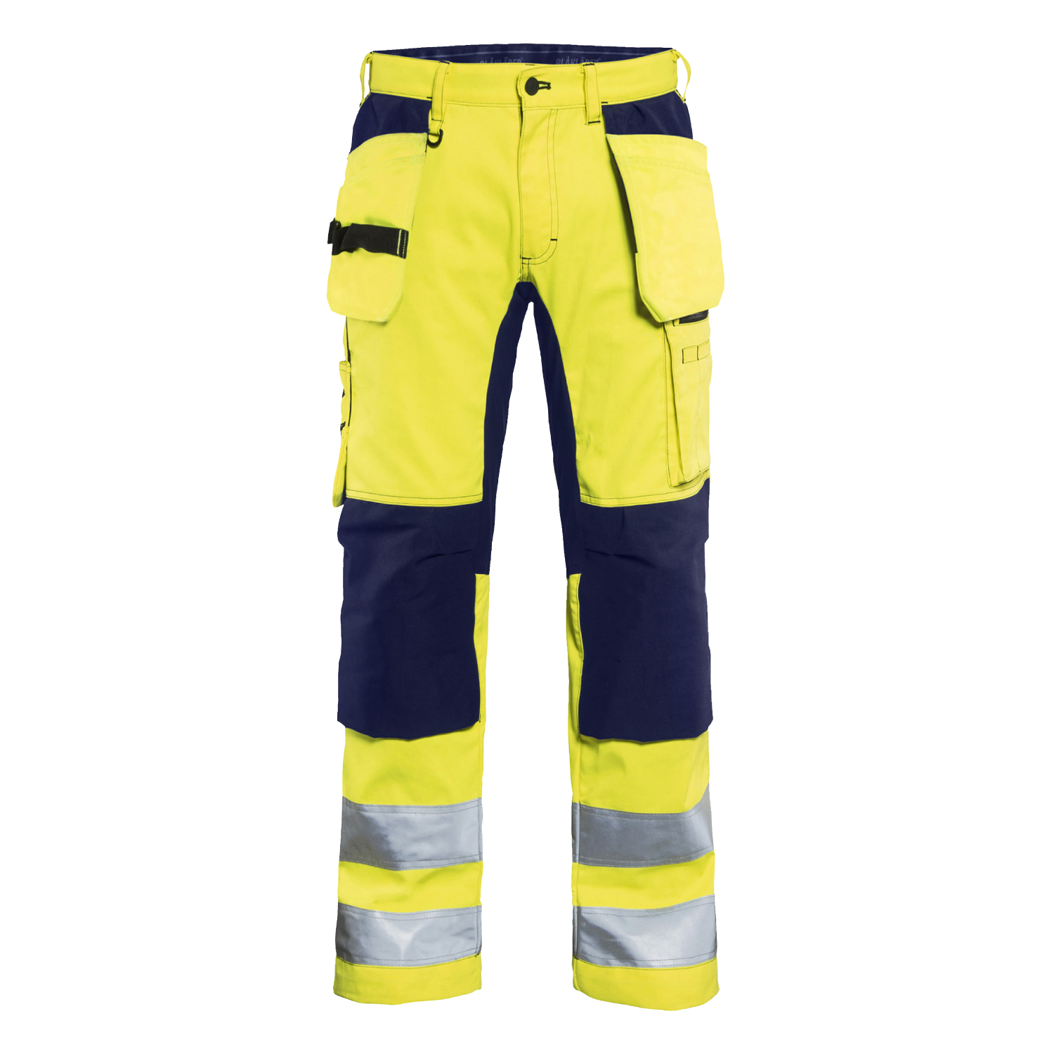 Varselbyxa från Blåkläder med förböjda ben och stretchpanel i gren, på knä och stuss. Gylf med plastblixtlås och hällor, varav en med D-ring. Cordura-förstärkta spikfickor och tumstocksficka och Cordura-stretch-förstärkta knäfickor.