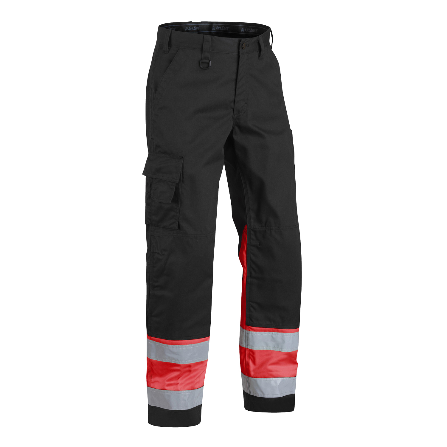 Varselbyxa från Blåkläder med 50 mm breda reflexer runt benen. Försedd med snedställda fickor och en extra ficka med dragkedja. Byxan har hällor, varav en med D-ring och gylf med plastblixtlås.