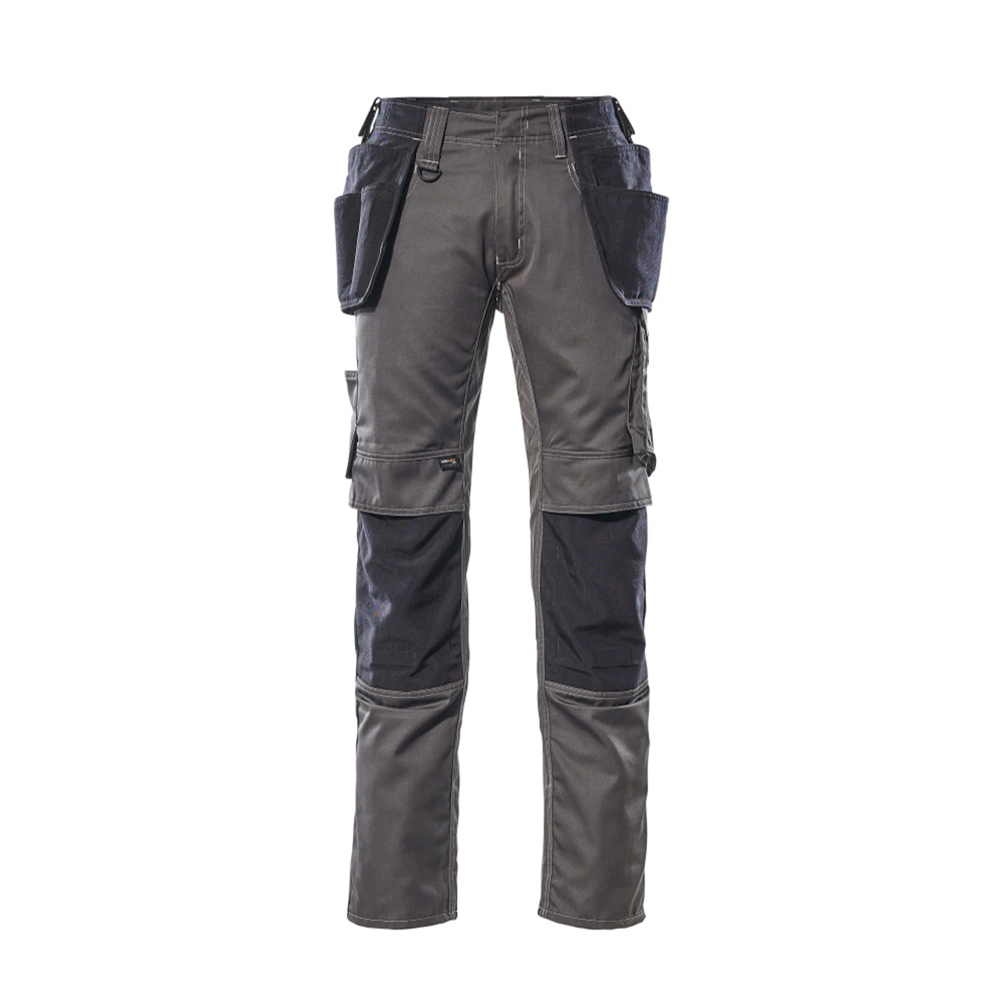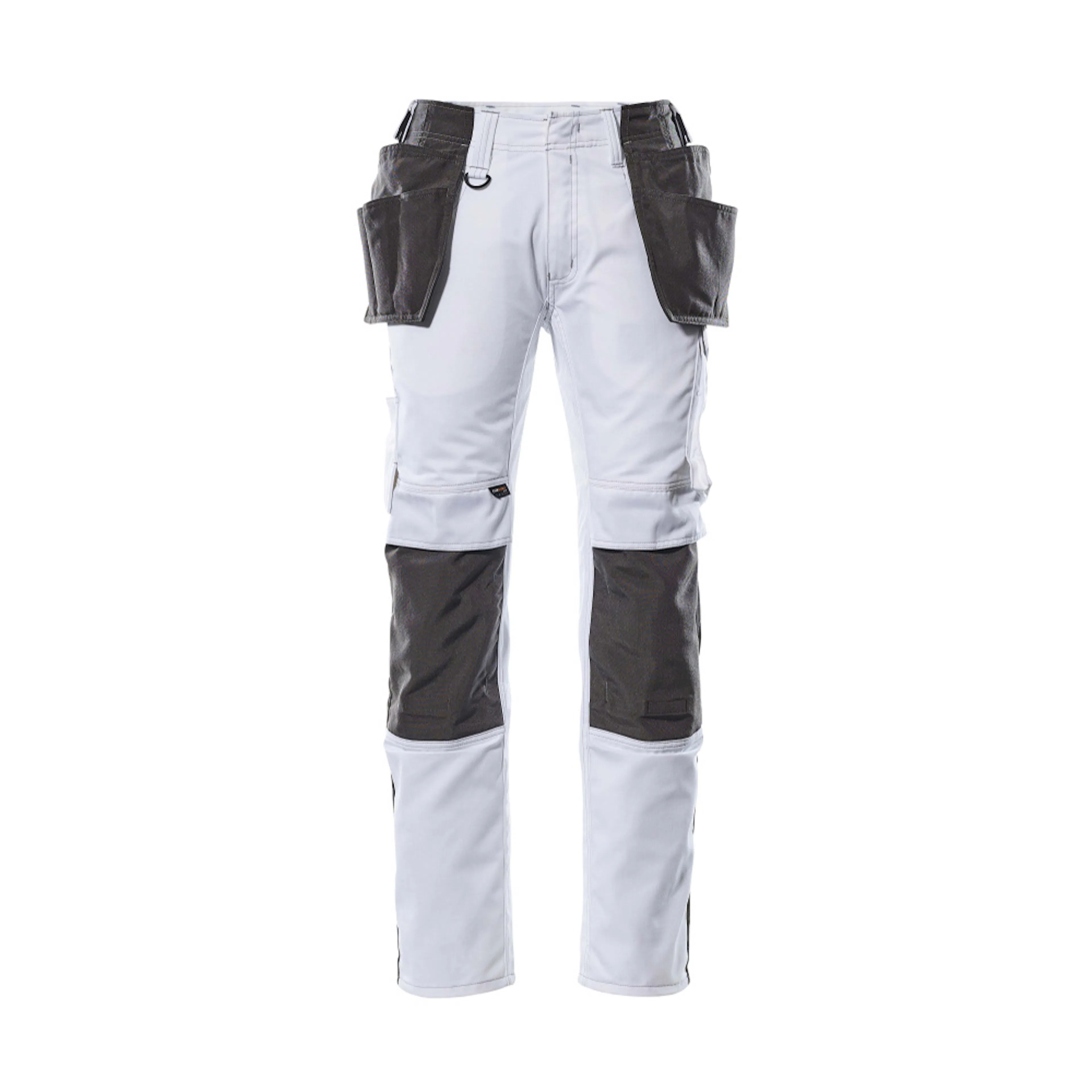 Slitstarka trenålssömmar på ben och i skrev förlänger produktens livslängd. Den låga skärningen med formskuren linning ser till att byxorna följer och stöder alla kroppens rörelser. Hängfickor i CORDURA® som är justerbara och har extra fickor till verktyg. Telefonficka integrerad i höger framficka. Av slitstark CORDURA® – med öppning för knäskydd från ovansidan och med lucka så att inte smuts samlas. Samcertifierade för användning med MASCOT:s knäskyddstyp SHORT eller LONG, eftersom knäskyddsfickan kan höjdjusteras.