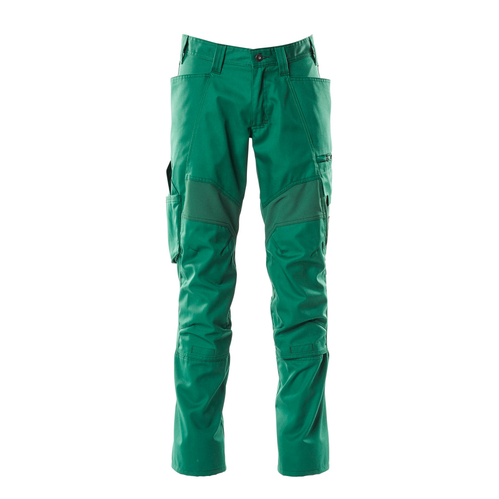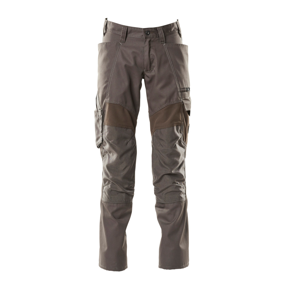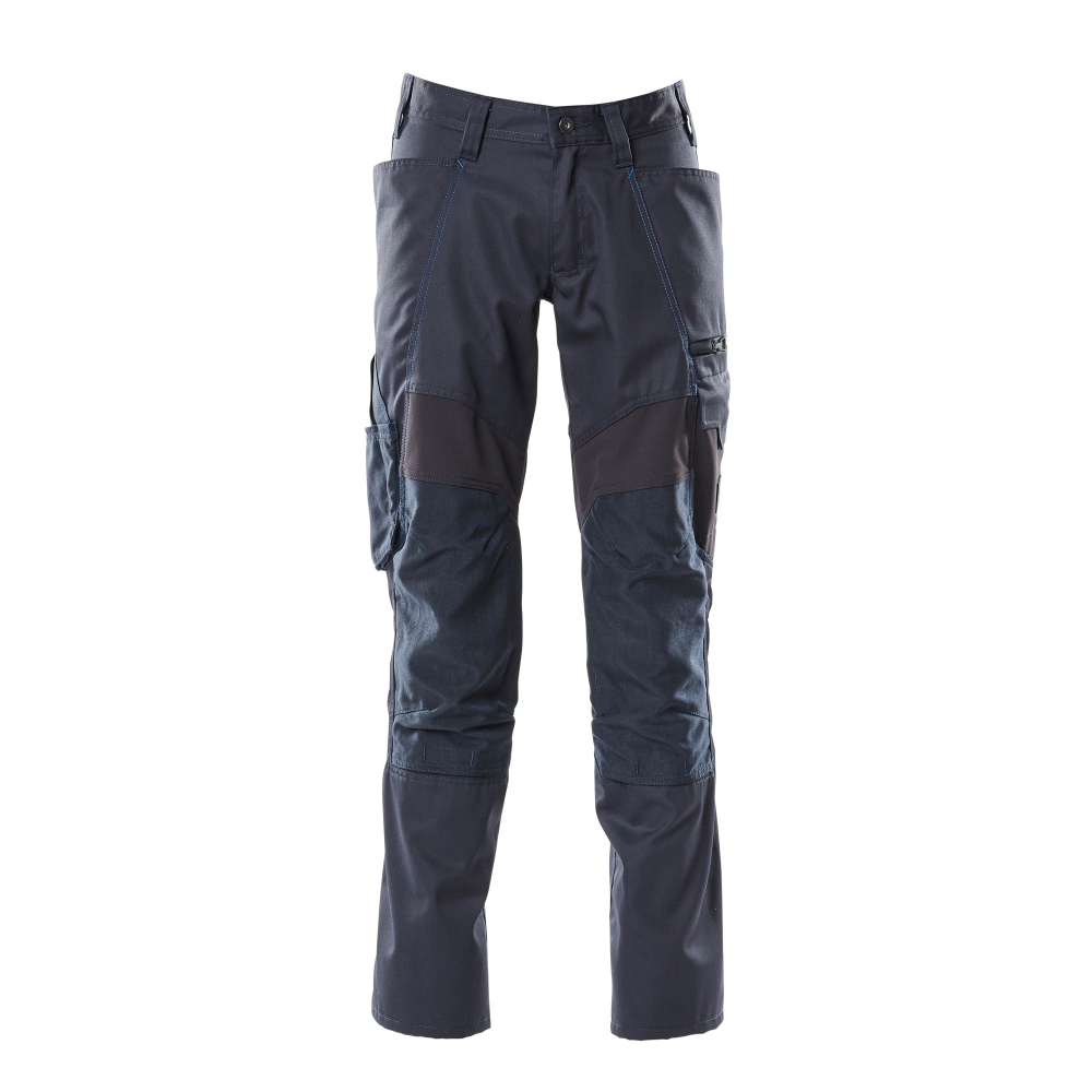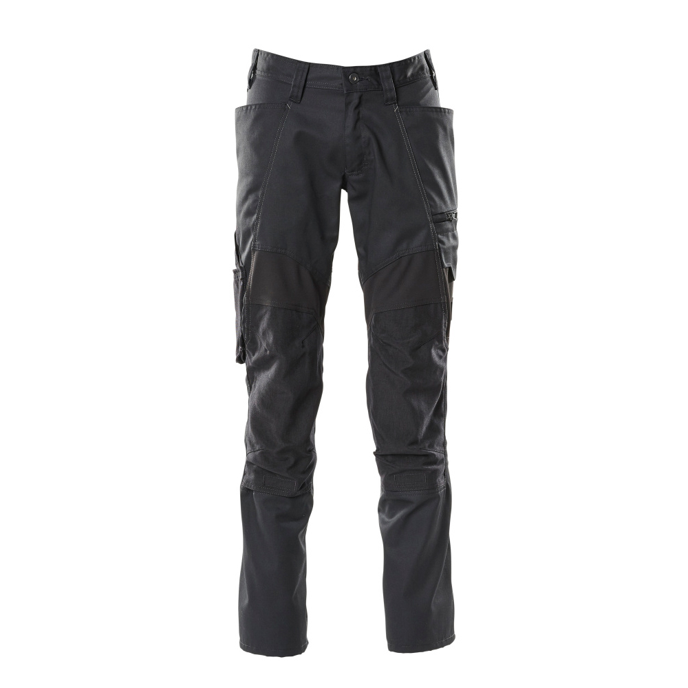 Många inlägg av elastiskt material som ger en unik rörelsefrihet. Den låga skärningen med formskuren linning ser till att byxorna följer och stöder alla kroppens rörelser. Ergonomiskt formade byxben är tillverkade efter kroppens naturliga rörelser. Knäfickorna i slitstarkt CORDURA® är reglerbara, så att knäskydden får den optimala placeringen. Som standard i tre olika benlängder så kan du välja den bästa passformen och den optimala placeringen av detaljer just för dig. Tyget tål industritvätt. Samcertifierade för användning med MASCOT:s knäskyddstyp SHORT eller LONG, eftersom knäskyddsfickan kan höjdjusteras.