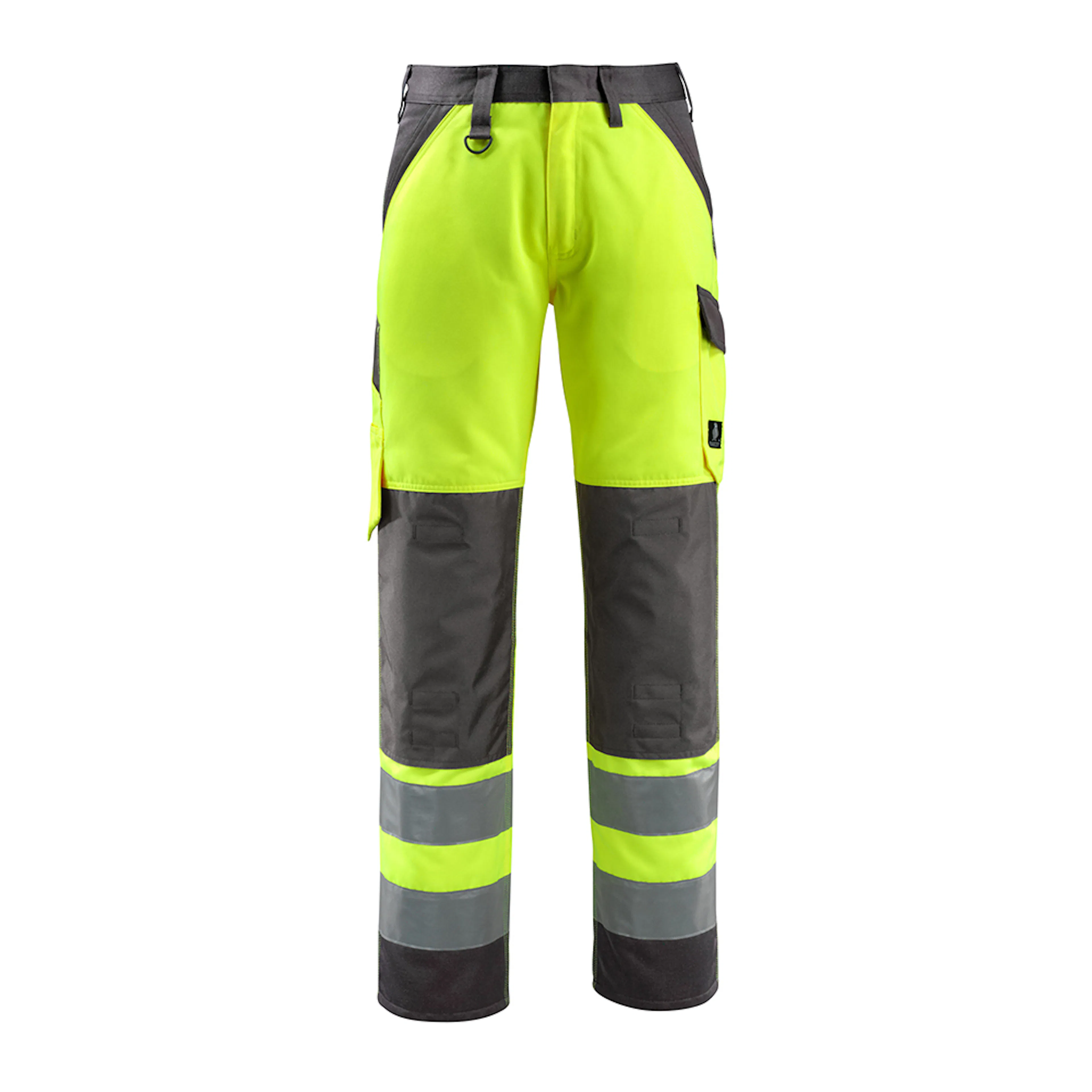Fluorescerande och med reflexer. Tvåfärgat. Trenålsstickningar på benen och i grenen. Byxbenen är ergonomiskt formade. Gylf med blixtlås. D-ring. Fickor på framstycket. Bakfickor med lock. Benficka med lock och dolda tryckknappar. Tumstocksficka med förstärkt öppning. Knäfickorna i polyester är justerbara. Vi rekommenderar 00718-100, 00418-100, 50454-916 & 20118-915 knäskydd till den här modellen. Samcertifierade med knäskyddstyp SHORT eller LONG enligt EN 14404.